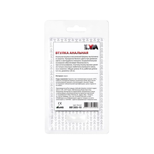 Технические характеристики Белая акриловая анальная втулка - 8 см.