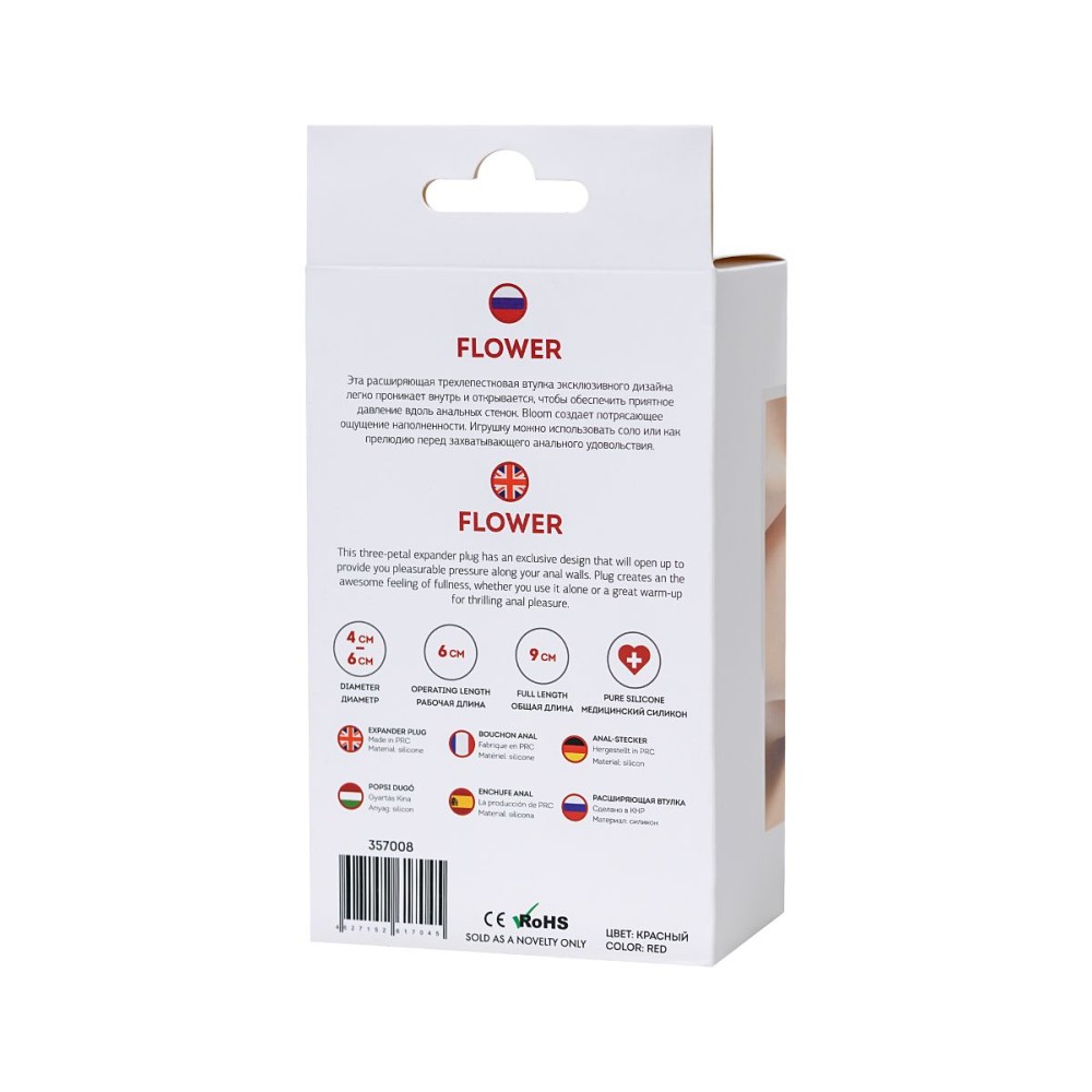 Диаметр 6.00 см и длина 9.00 см делают эту пробку комфортной для постепенного расширения. Уникальная цветочная форма основания добавляет эстетичности и удобства при использовании.