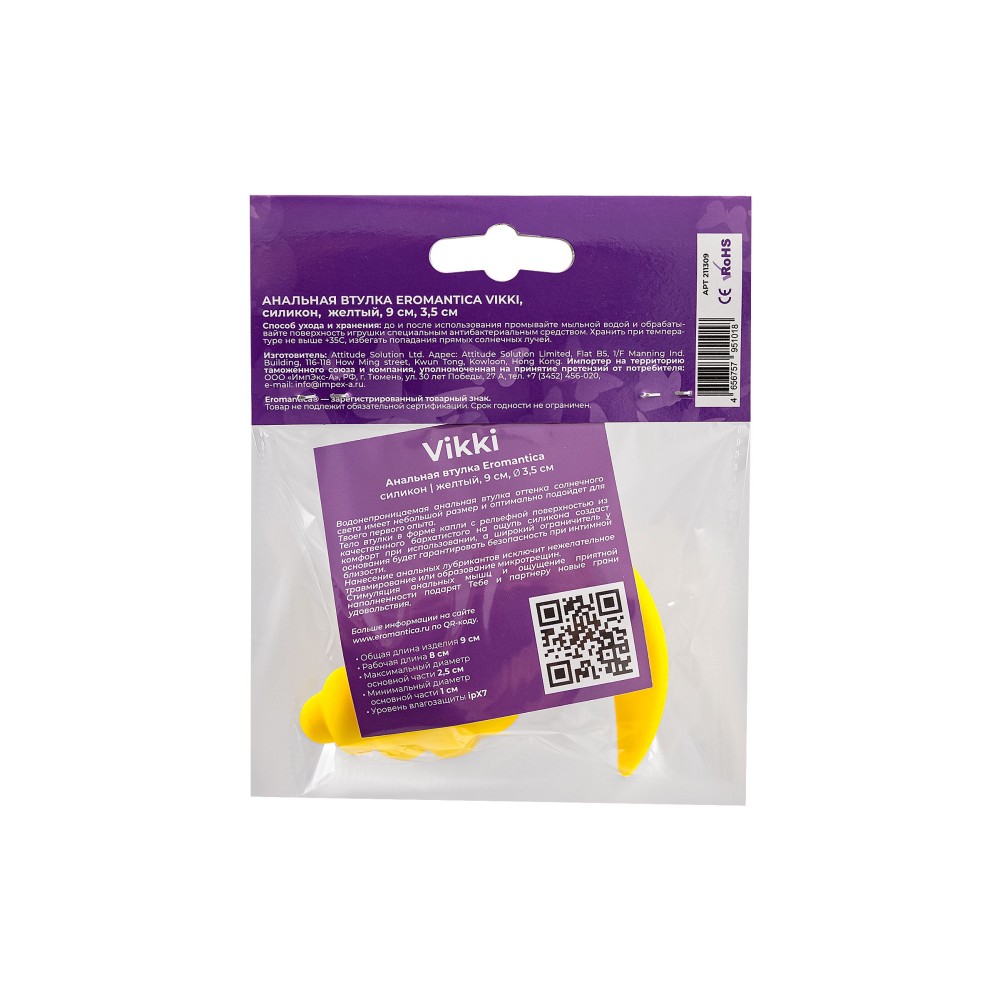 Технические характеристики Желтая анальная втулка Vikki - 9 см.
