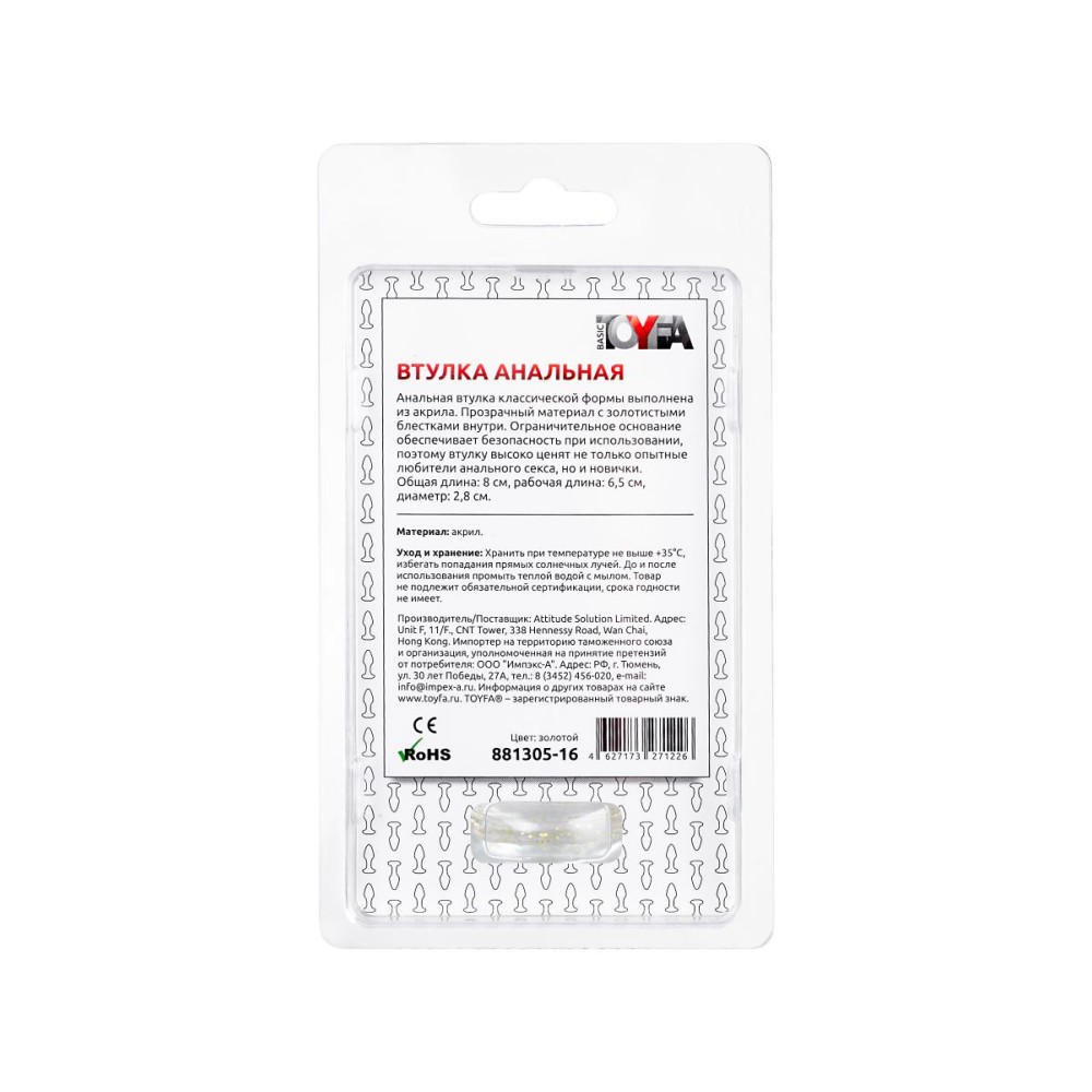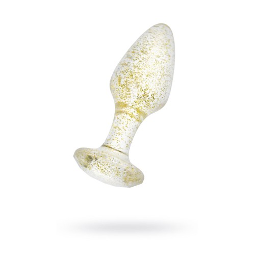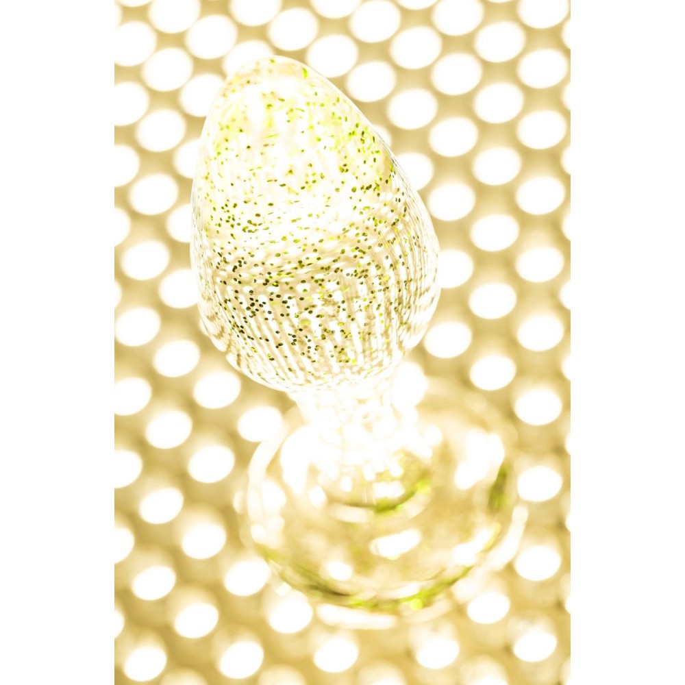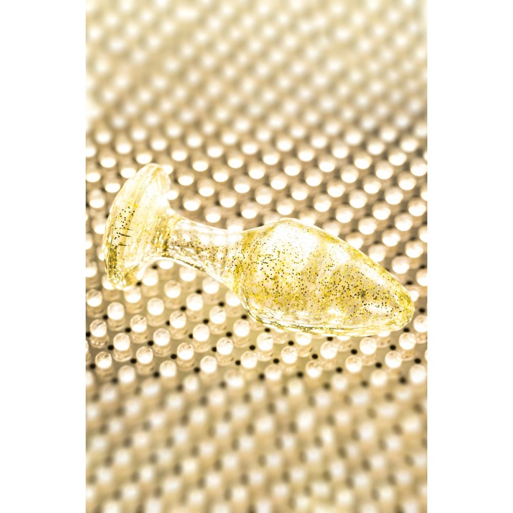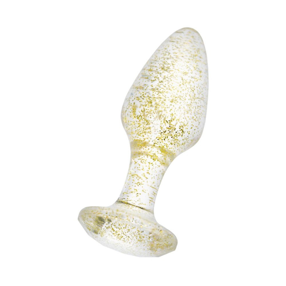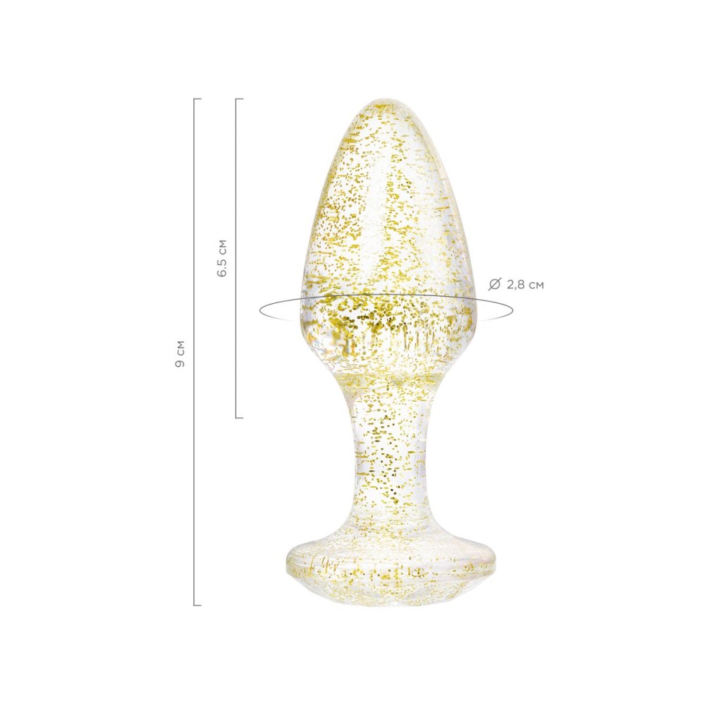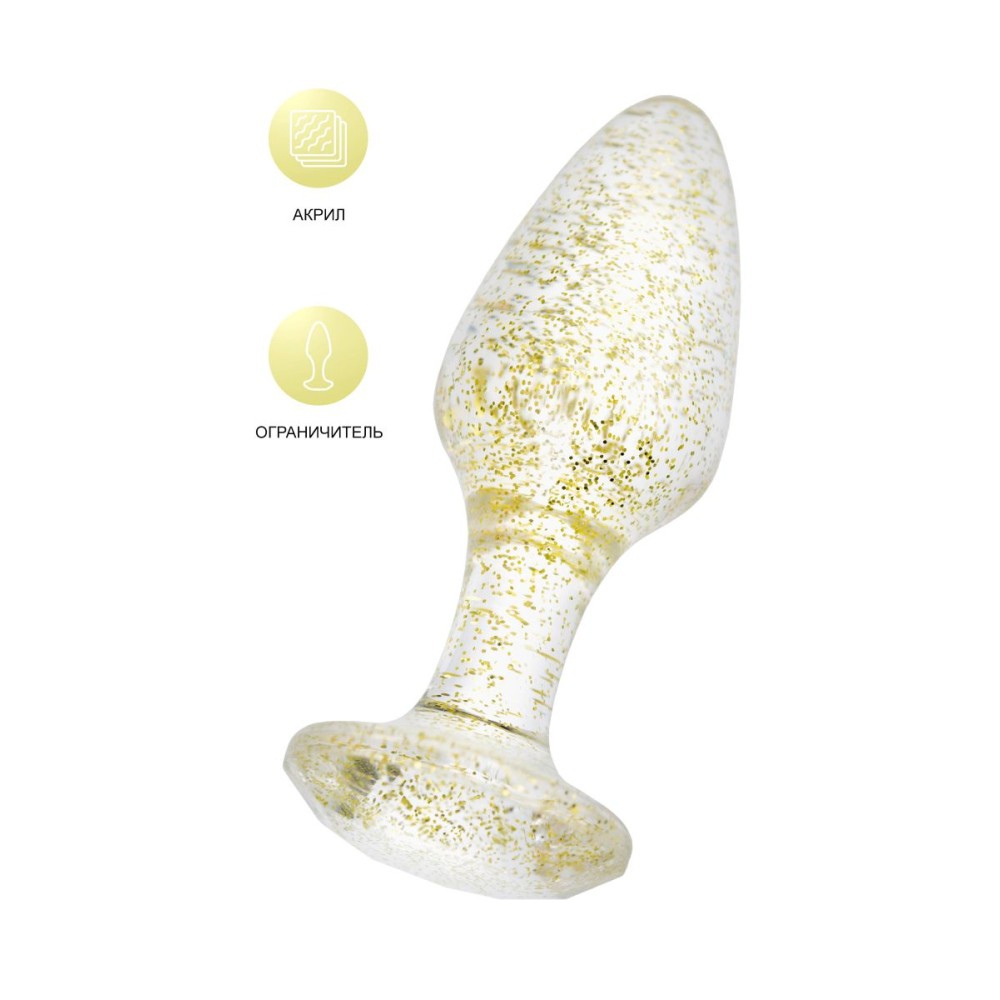 Анальная втулка классической формы выполнена из акрила. Прозрачный материал с золотистыми блестками внутри. Ограничительное основание обеспечивает безопасность при использовании, поэтому втулку высоко ценят не только опытные любители анального секса, но и новички. Рабочая длина - 6,5 см.
