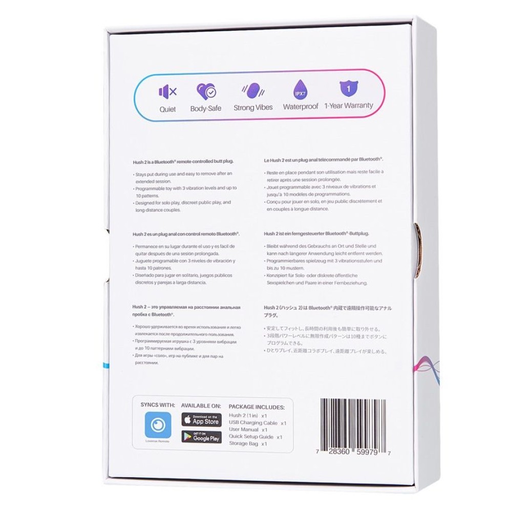 Lovense Hush 2 — это управляемая на расстоянии анальная пробка с Bluetooth. Размер S идеально подойдет для тех, кто хочет сделать шаг вперед в мире анальных удовольствий. Супергладкое и бесшовное покрытие из медицинского силикона идеально подходит для длительного ношения до четырех часов. Шелковистый материал и плавная форма обеспечивают комфортное введение. Узкая ножка и широкий ограничитель гарантируют безопасность использования. Водонепроницаемая игрушка Lovense Hush 2 обладает мощным мотором и глубокой низкочастотной вибрацией. Сильные и приятные вибрации помогают достичь небывалого наслаждения как в соло игре, так и в прелюдии с партнером. В вашем распоряжении три уровня мощности и четыре предустановленных режима вибрации, управляемых кнопками в основании девайса. Кроме того, игровые возможности не ограничены с приложением Lovense Remote. Установить на смартфон и использовать игрушку дистанционно легко, даже находясь на расстоянии с партнером. Варианты создания собственных ритмов вибрации, реагирующих на музыкальный плейлист или голос — все это доступно с инновационной технологией управления по Bluetooth Lovense. Настраивайте уровни мощности вибрации по своему вкусу и сохраняйте их для дальнейшего использования. Также запрограммируйте до 10 любимых паттернов и обеспечьте себе сверхсильные оргазмы! Рекомендуется использовать со смазкой на водной основе. Высококачественный медицинский силикон. Время работы - до 240 минут. Время зарядки 60 минут. Магнитная USB зарядка. Водонепроницаемость IPX7.
