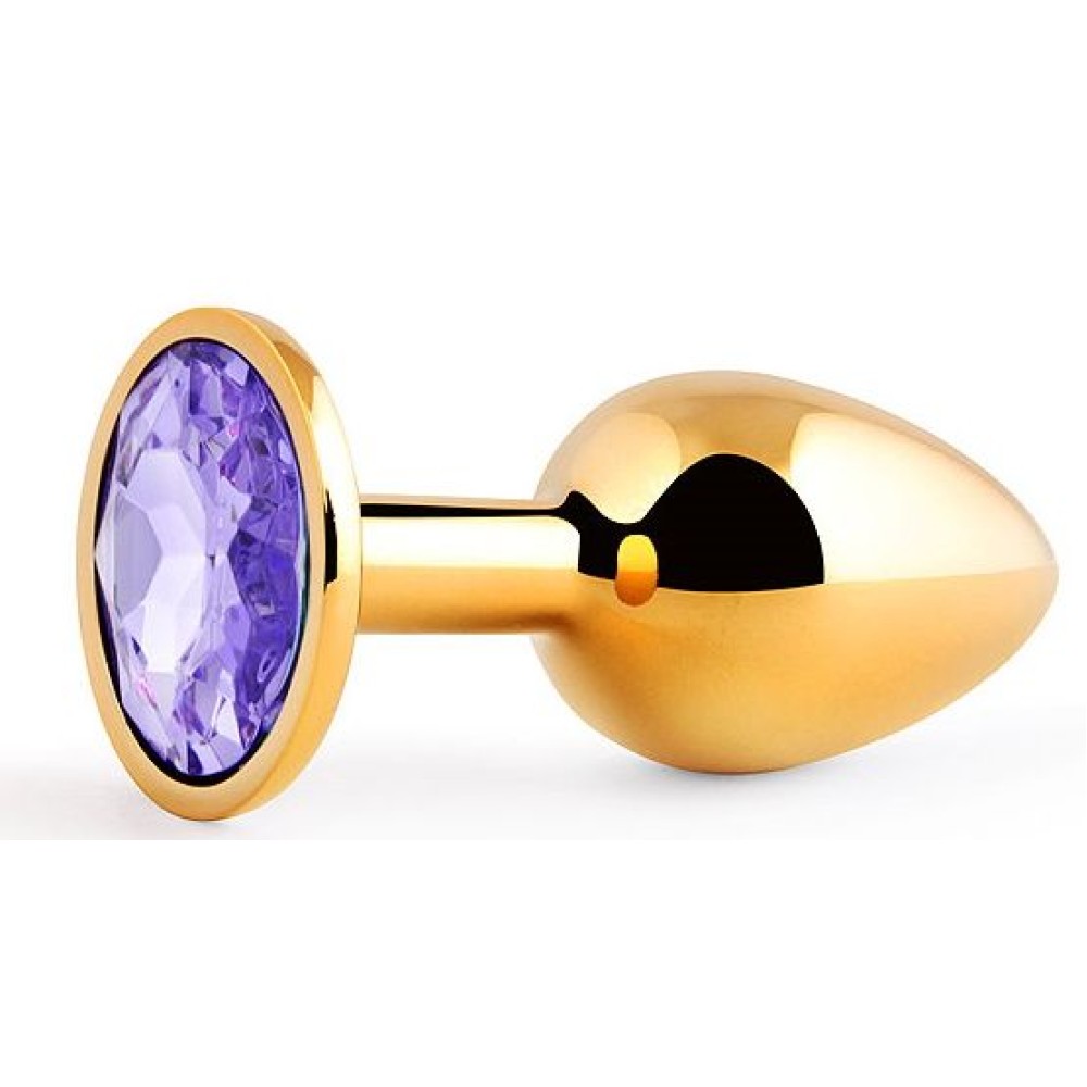 Золотистая анальная пробка с фиолетовым стразом - 7,2 см.