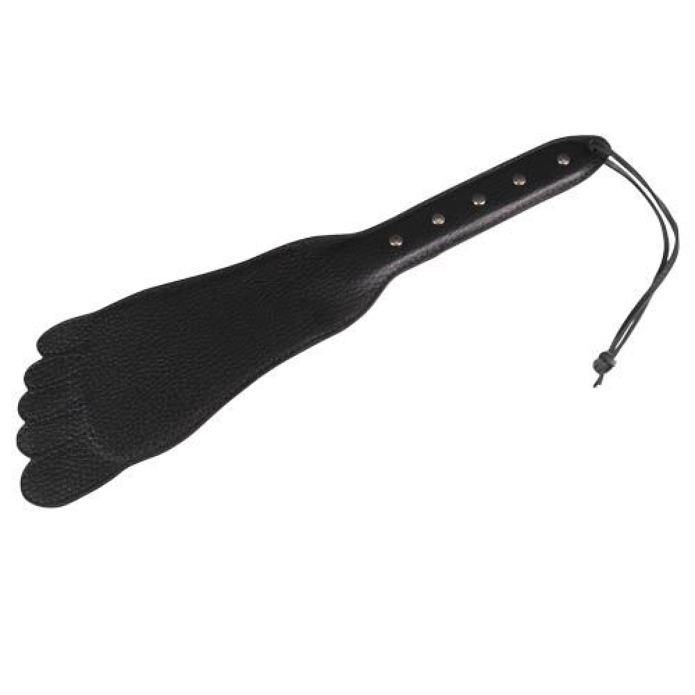 Чёрная хлопалка-ступня длиной 34,5 см — изысканный аксессуар для BDSM-практик, выполненный из натуральной кожи. Универсальная модель подходит для обоих полов, идеальна для садомазохистских игр. Прочный материал обеспечивает долговечность и приятные тактильные ощущения. В комплекте — стильная пластиковая коробка для хранения. Российское производство и бренд гарантируют качество и надёжность.
