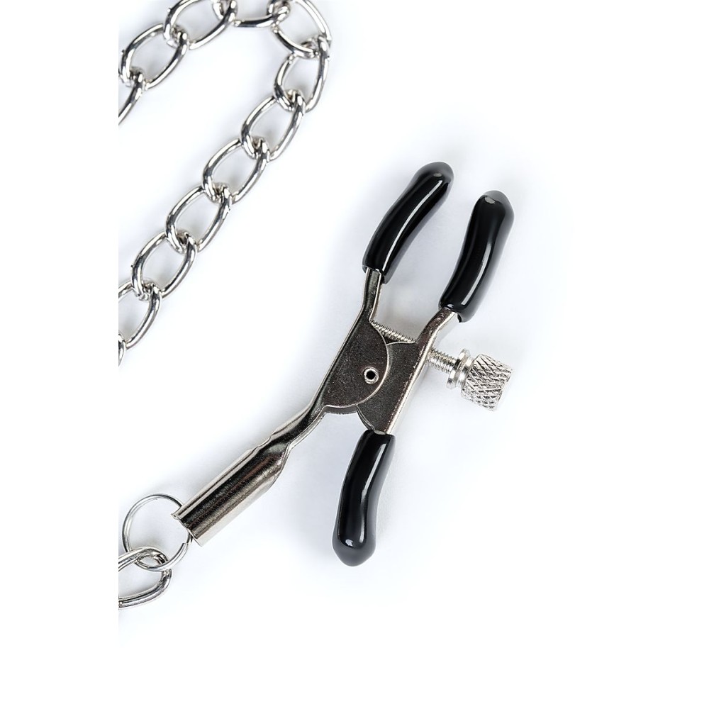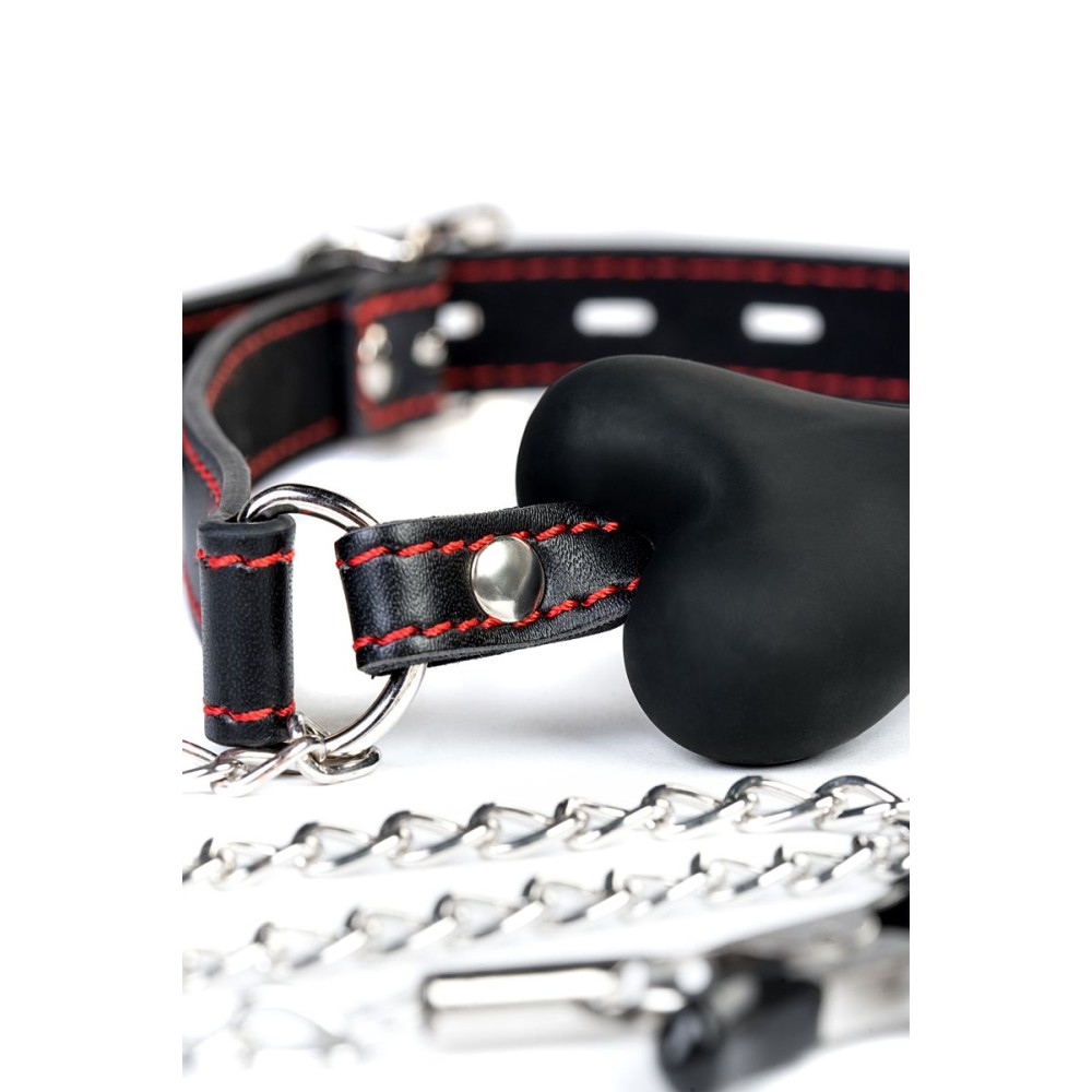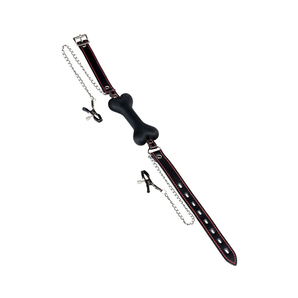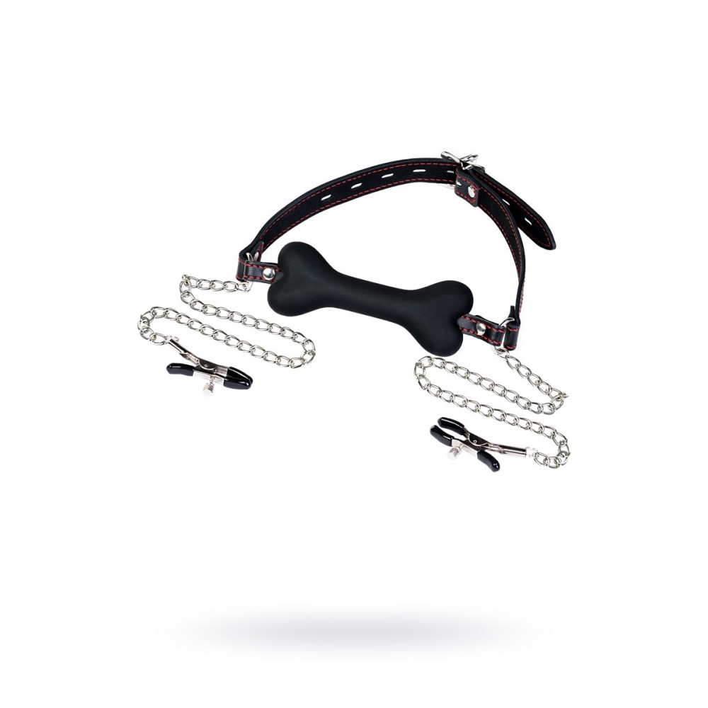 В комплекте зажимы для сосков с регулируемой силой сжатия, позволяющие контролировать интенсивность ощущений. Кляп в форме элегантной косточки фиксируется надежно, но комфортно. Подходит для пар любого гендера.