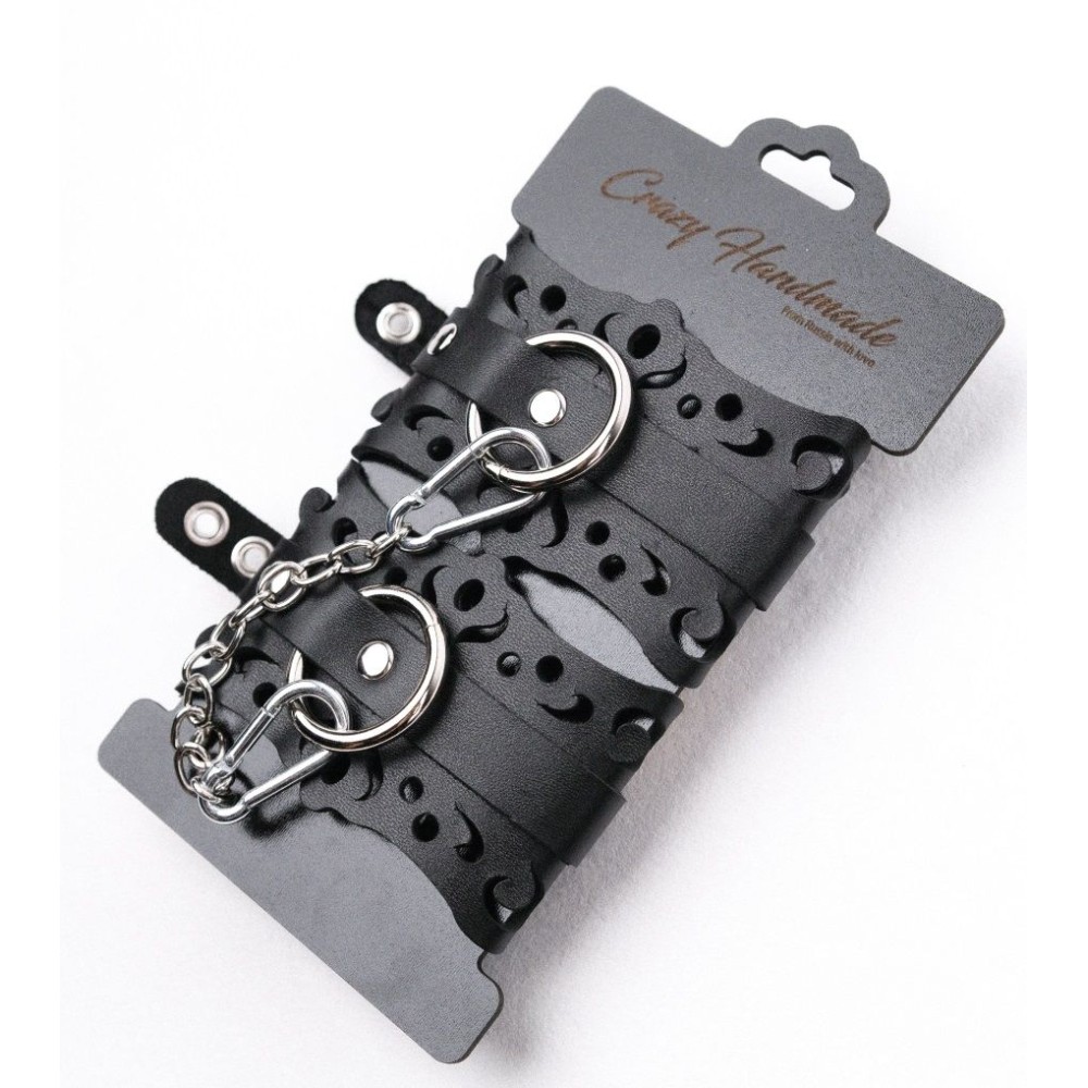 Стильные кожаные наручники черного цвета с ажурным дизайном - идеальный аксессуар для БДСМ-практик. Изготовлены из натуральной кожи российского производства, что гарантирует прочность и приятные тактильные ощущения.