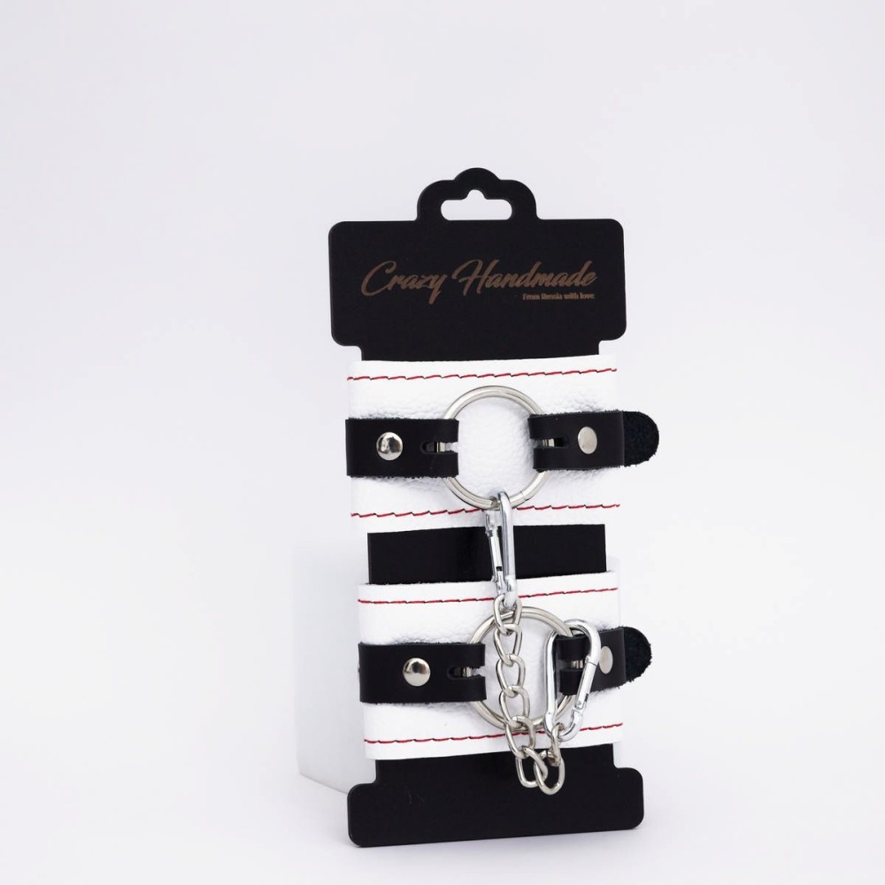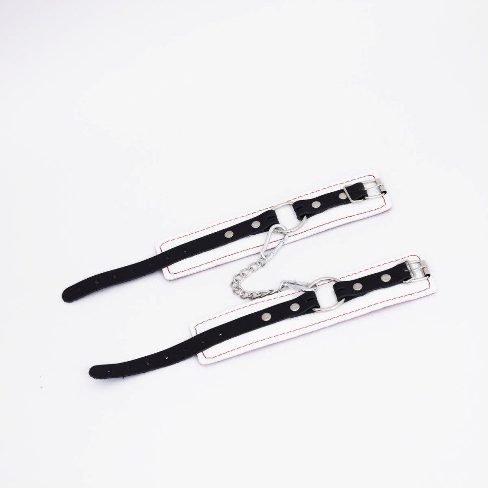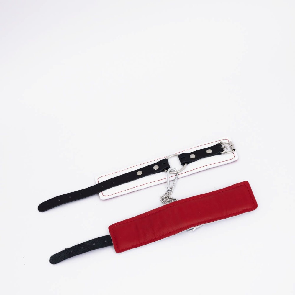 Бело-красные кожаные оковы для эротических игр. Универсальный дизайн подходит для обоих партнеров. Изготовлены из натуральной кожи российского производства. Идеальная атрибутика для БДСМ-практик и ролевых сценариев. Доставляются без упаковки для вашего удобства.