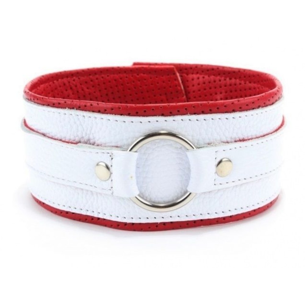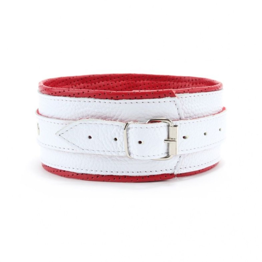 Бело-красный кожаный ошейник для эстетики БДСМ. Натуральная кожа российского производства обеспечивает долговечность и приятные тактильные ощущения. Универсальный дизайн подходит для всех гендеров. Функциональный аксессуар для садомазохистских практик с контрастной цветовой гаммой. Поставляется без упаковки.
