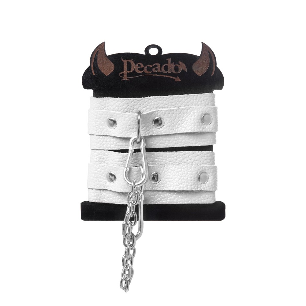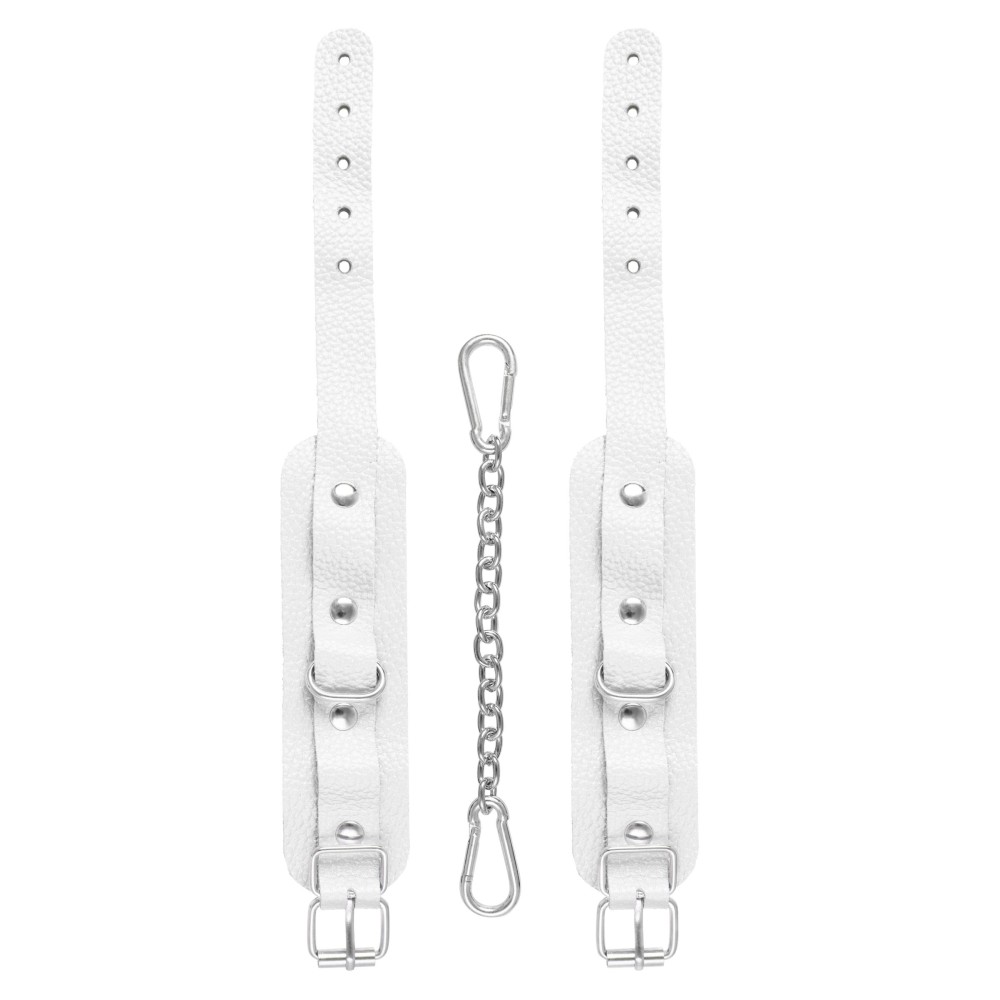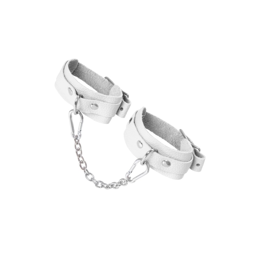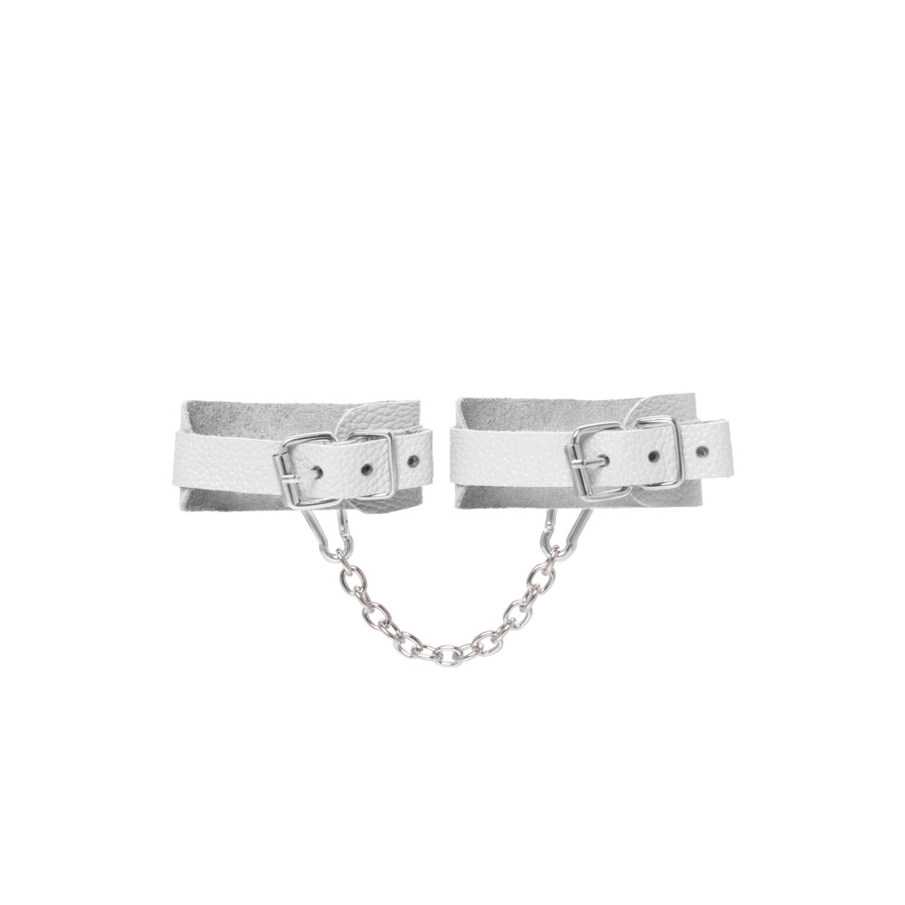 Белые мини-оковы со скруглёнными углами — элегантный аксессуар для БДСМ-практик. Изготовлены из комбинации натуральной кожи и металла, обеспечивая прочность и приятные тактильные ощущения. Скруглённая форма углов повышает безопасность использования. Подходят для обоих партнёров. Российское производство и бренд. Поставляются без упаковки. Идеальны для экспериментов в ролевых играх и садомазохистских сценариев.