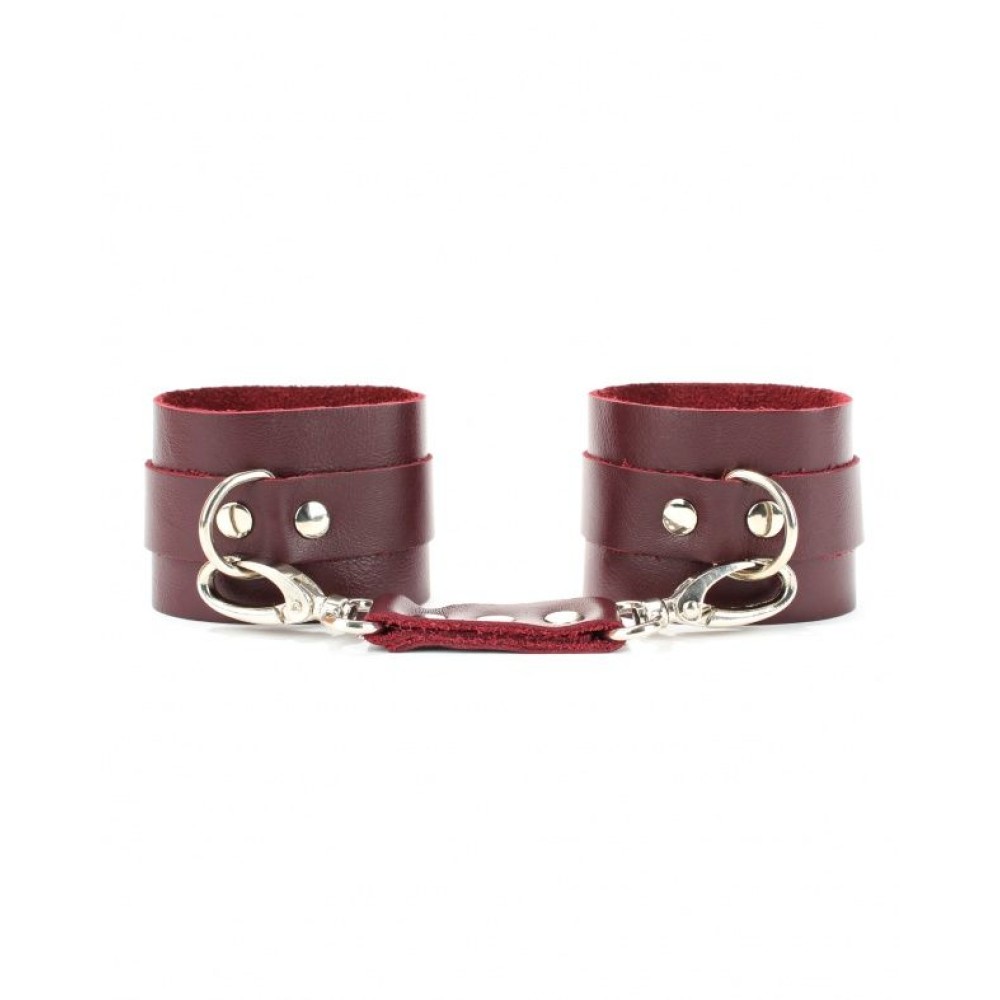 Роскошные наручники глубокого бордового оттенка, созданные для ценителей эстетики БДСМ. Изготовлены из натуральной кожи высшего качества, которая с течением времени приобретает уникальный рельеф и становится еще комфортнее в использовании.