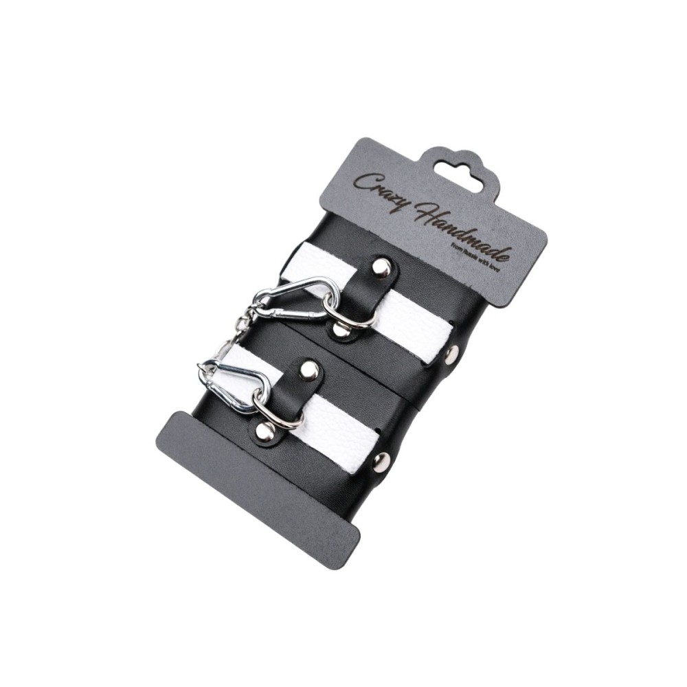 Черно-белые кожаные наручники для БДСМ игр. Универсальный аксессуар для обоих партнеров, выполненный из натуральной кожи российского производства. Идеальная садомазохистская атрибутика для ограничения подвижности и усиления ощущений. Классическое черно-белое сочетание создает эстетичный контраст. Поставляется без упаковки.