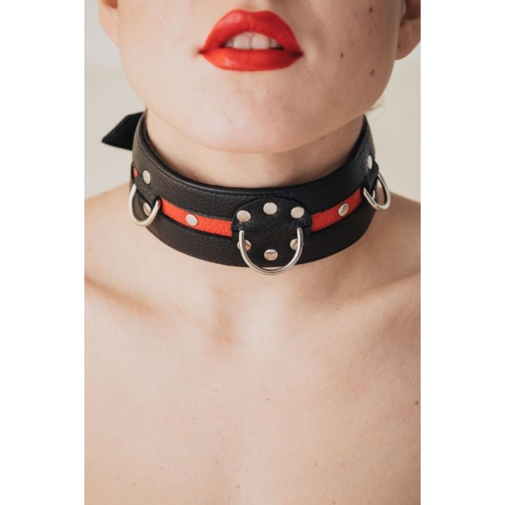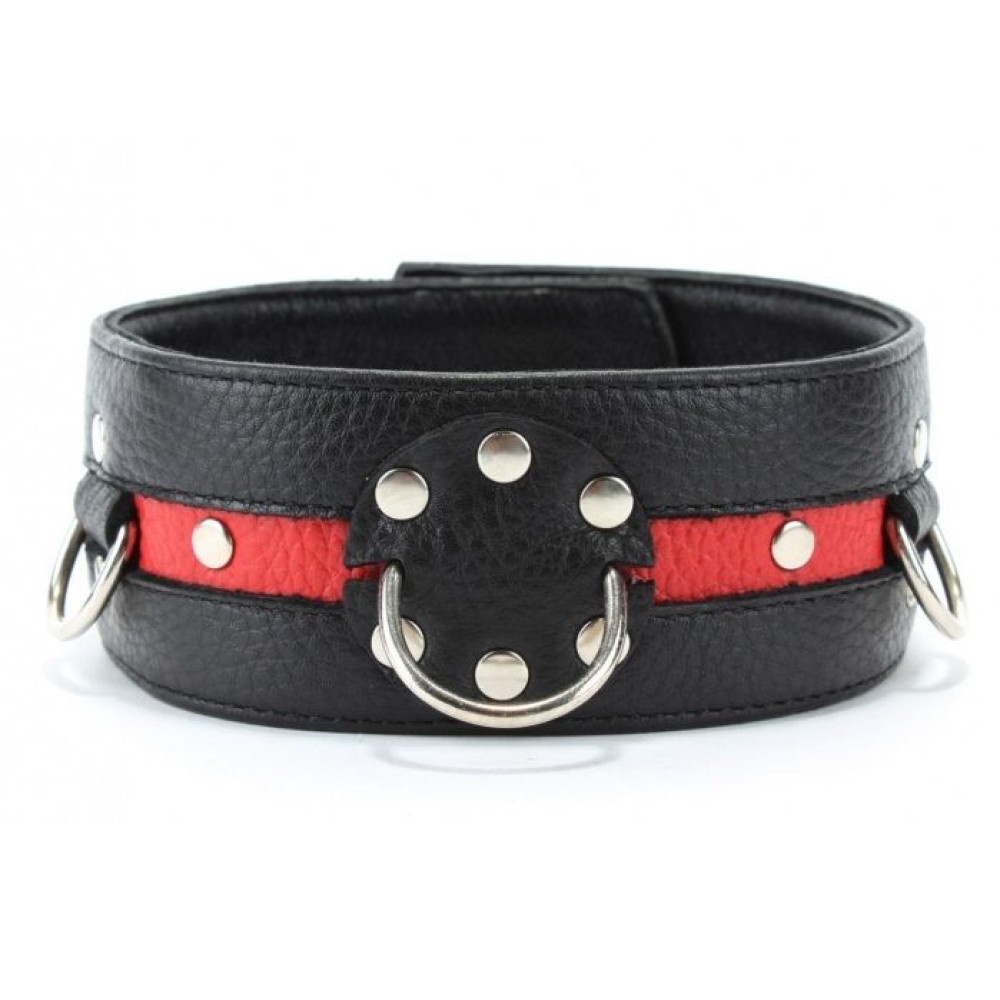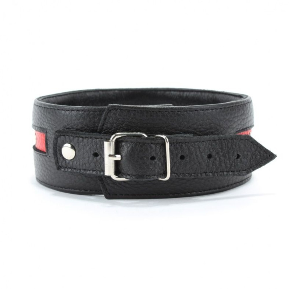 Черно-красный ошейник на пряжке из натуральной кожи — стильный аксессуар для БДСМ-практик. Универсальная модель подходит для обоих партнеров. Российское производство гарантирует качество и долговечность. Идеален для ролевых игр и доминирования. Поставляется без упаковки для немедленного использования.