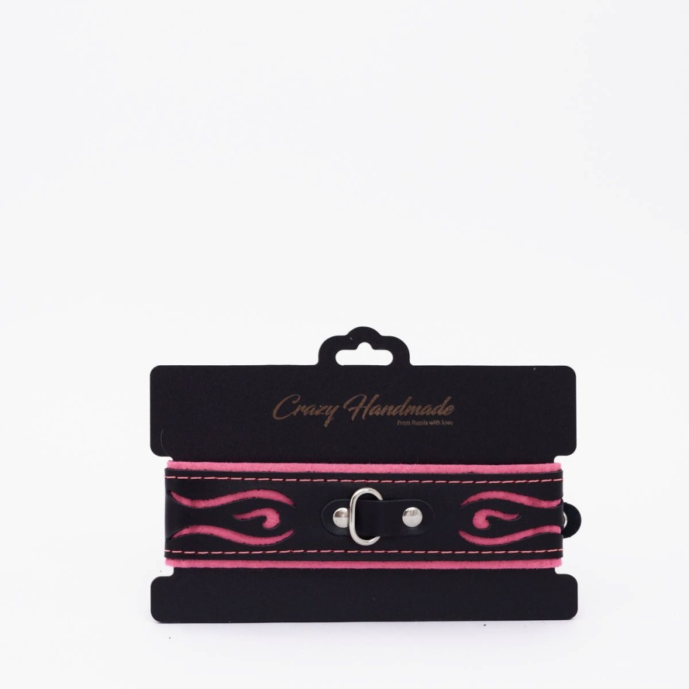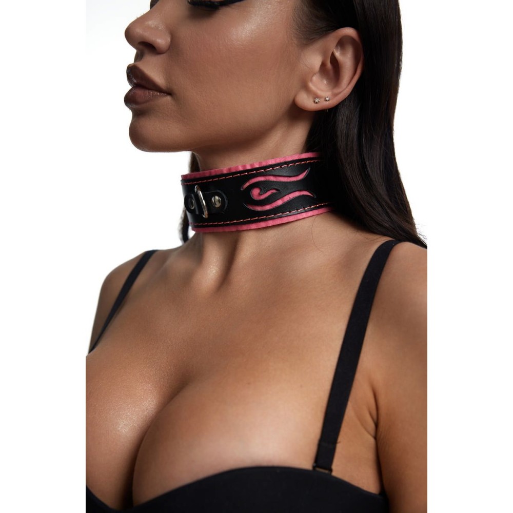 Черно-розовый кожаный ошейник с контрастной розовой строчкой — стильный аксессуар для БДСМ-практик. Изготовлен из натуральной кожи российского производства, длина регулируется до 44 см. Универсальная модель подходит для всех гендеров. Функциональный элемент для садомазохистских игр. Поставляется без упаковки.