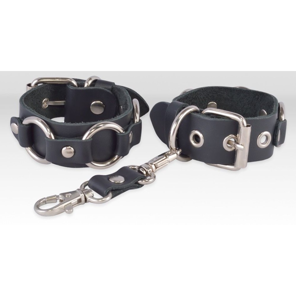 Наручники из натуральной кожи не оставят равнодушными любителей поэкспериментировать и позволят доминанту почувствовать истинную власть над партнером. Стиль задает строгий цвет в сочетании с металлической фурнитурой. Украшены кольцами и клепками. Пряжка поможет комфортно зафиксировать наручники на запястьях. Размер универсальный. Ширина наручников - 2,5 см.