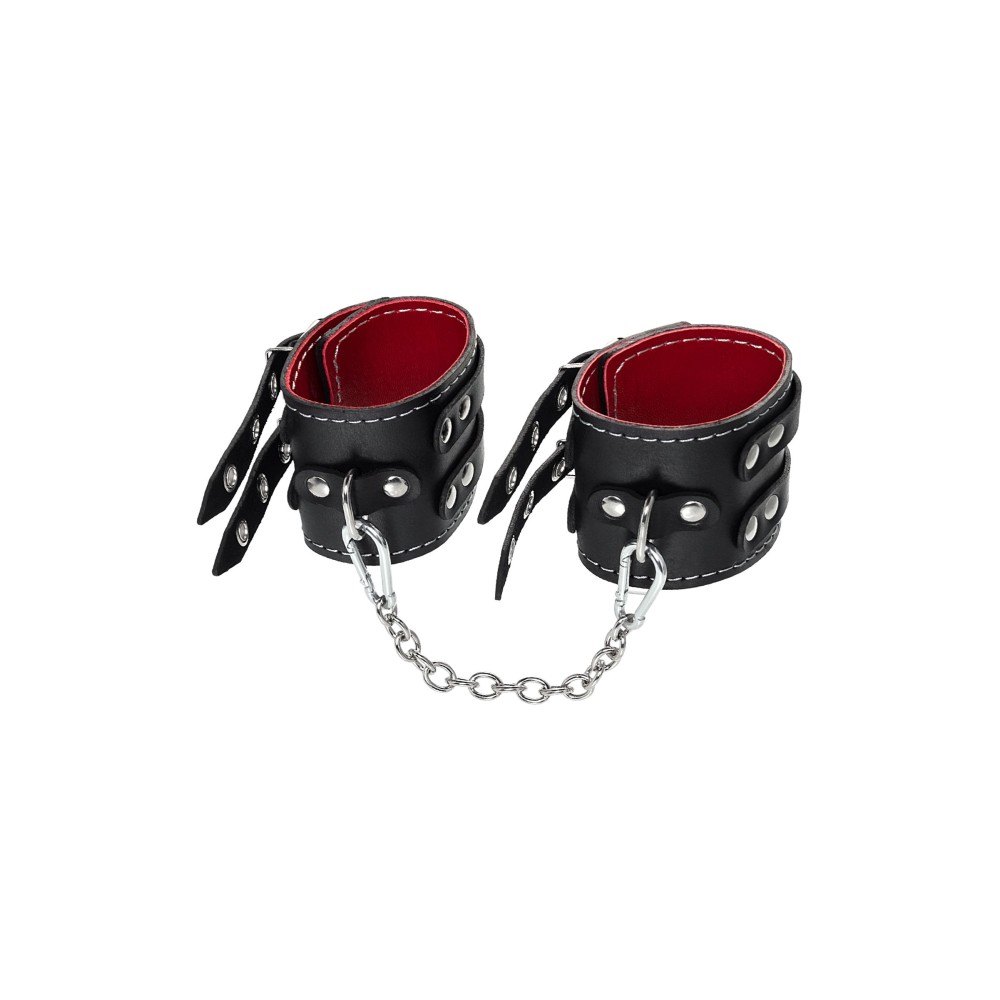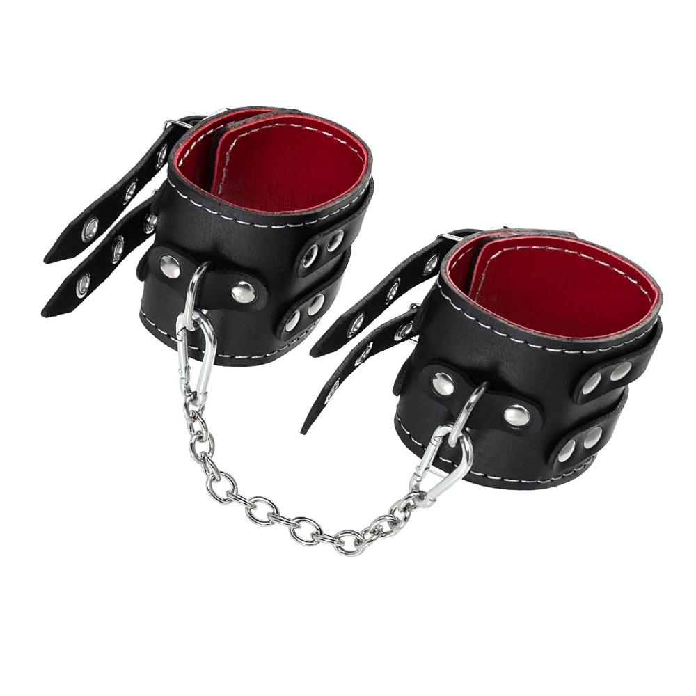 Элегантные и стильные наручники из натуральной кожи для БДСМ-практик. Модель выполнена в классическом черном цвете с эффектной красной подкладкой, что создает контрастный и притягательный внешний вид.