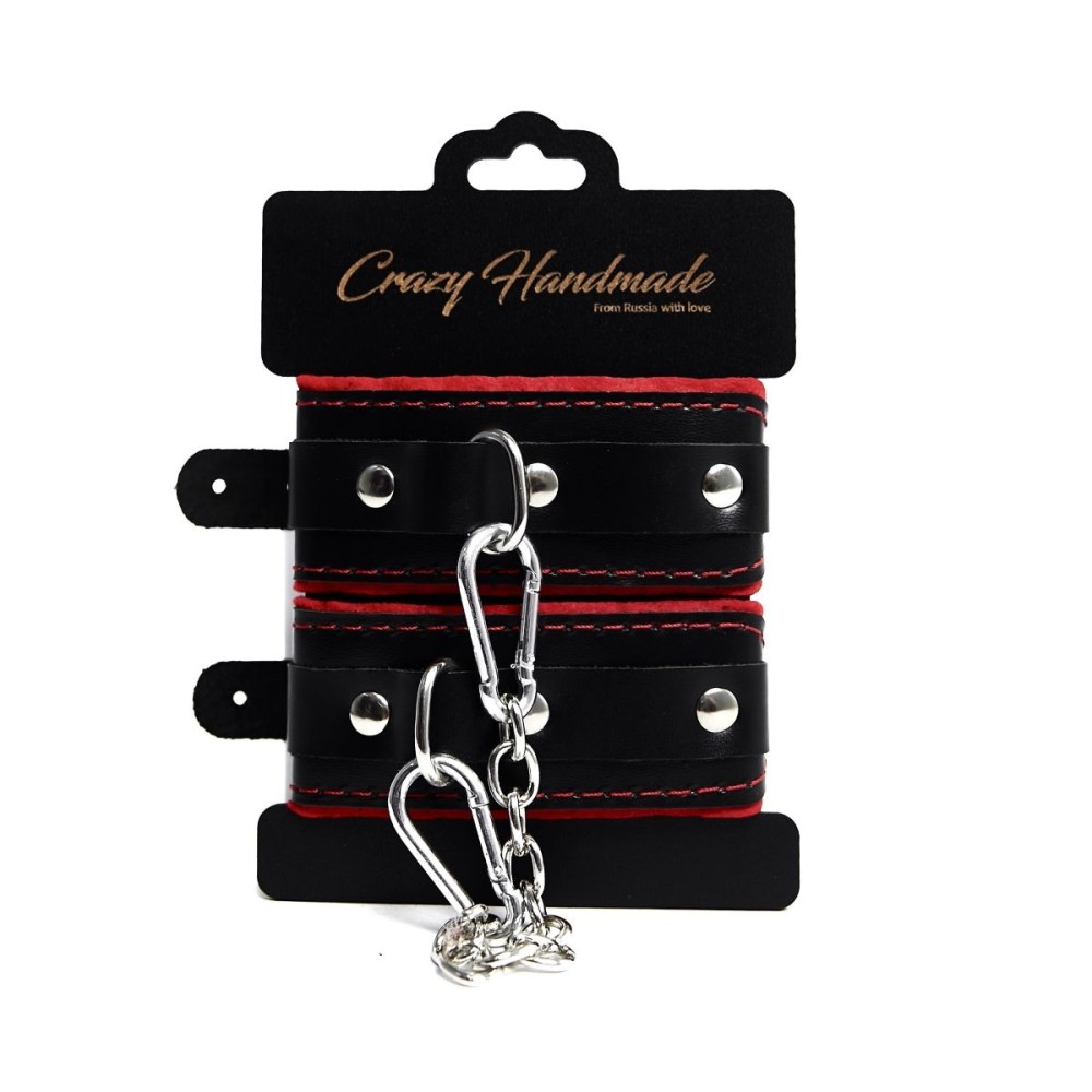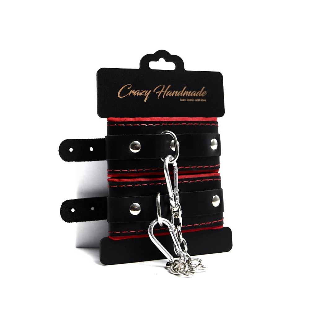 Черные наручники с красной подкладкой из натуральной кожи для эстетики и комфорта. Скругленные ремешки со строчками обеспечивают безопасную фиксацию без дискомфорта. Универсальный размер подходит для обоих партнеров. Идеальная садомазохистская атрибутика для ролевых игр и расширения интимных границ. Российское производство гарантирует качество материалов и исполнения. Поставляются без упаковки — готовы к немедленному использованию.