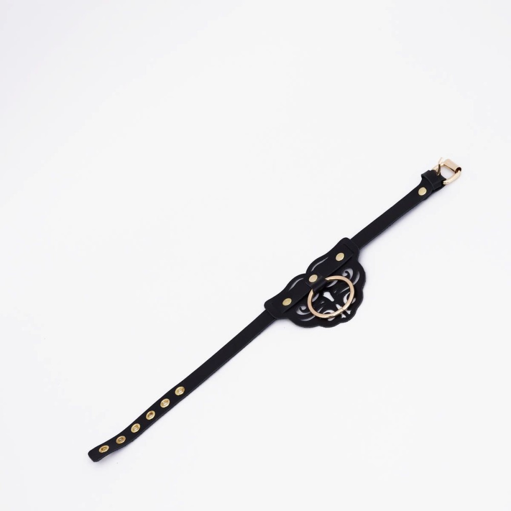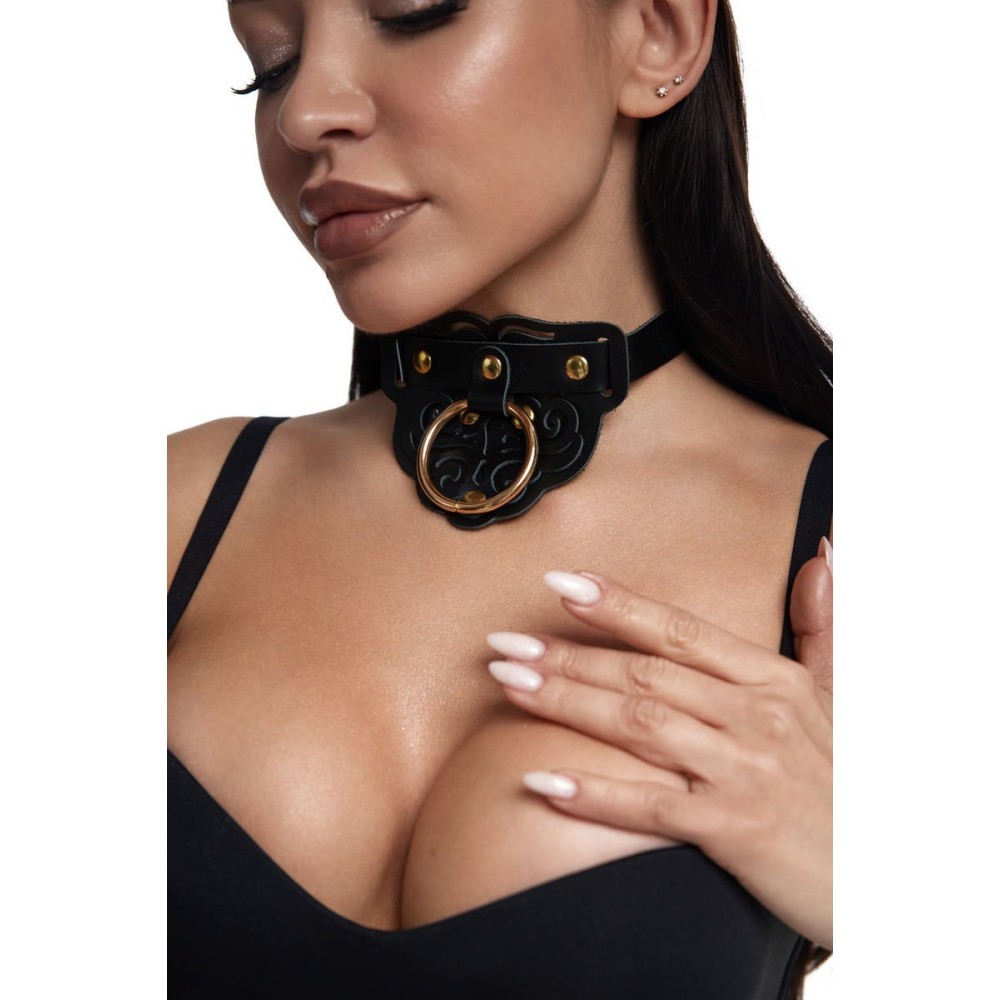 Черный фигурный кожаный ошейник с золотистой фурнитурой — элегантный аксессуар для БДСМ-практик. Изготовлен из натуральной кожи и металла, подходит для обоих партнеров. Российское производство и бренд. Поставляется без упаковки. Идеален для ролевых игр и доминирования.