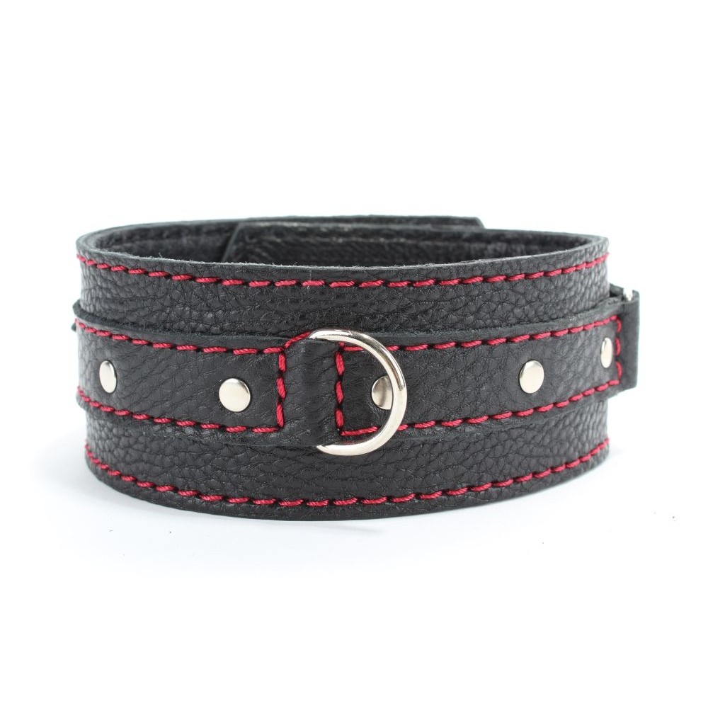 Черный ошейник из натуральной кожи с красной строчкой и кольцом