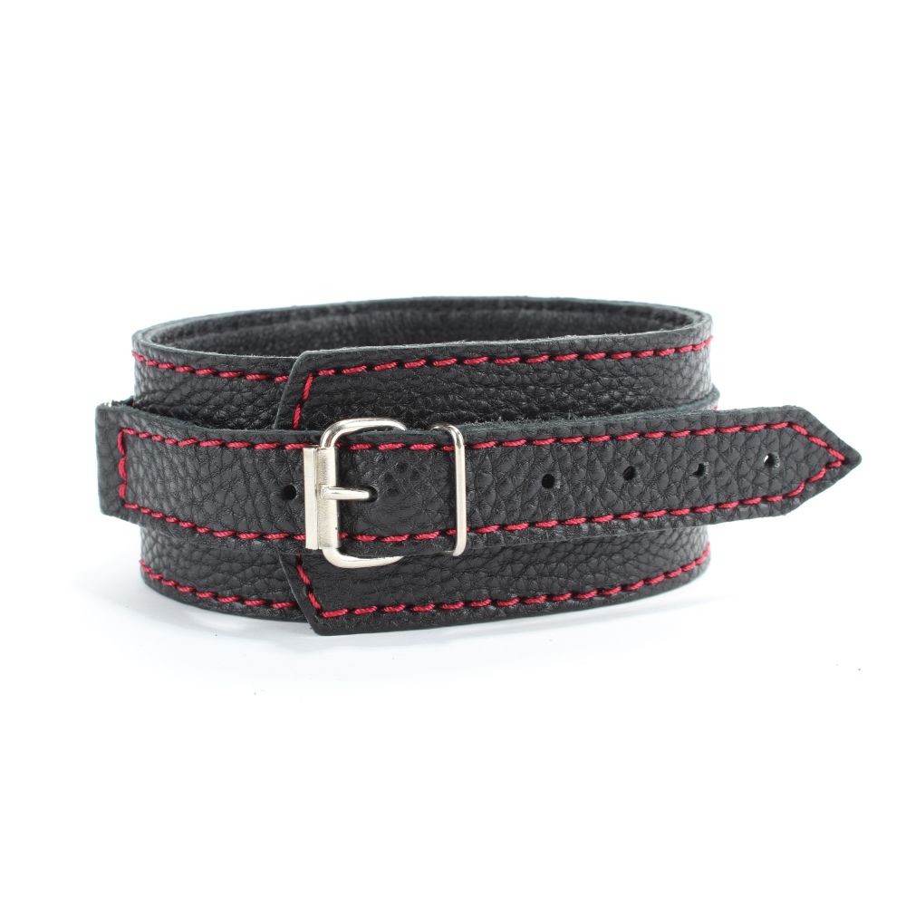 Черный онихник из натуральной кожи с контрастной красной строчкой и металлическим кольцом — стильный аксессуар для БДСМ-практик. Универсальная модель подходит для всех гендеров. Российское производство гарантирует качество материалов и исполнения. Кожаный ошейник поставляется без упаковки, готов к немедленному использованию. Идеален для ролевых игр и расширения интимного опыта.
