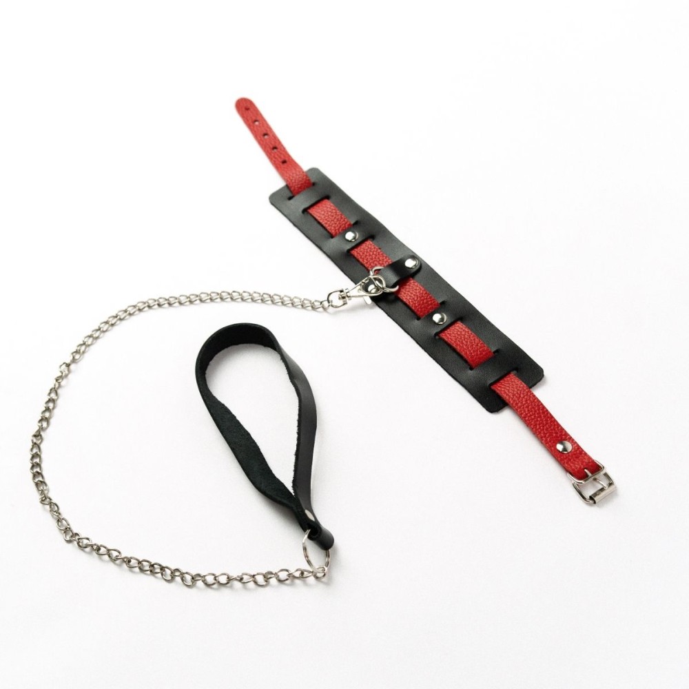 Черный ошейник с красным ремешком и поводком — стильный аксессуар для БДСМ-практик. Изготовлен из натуральной кожи, отличается прочностью и приятной текстурой. Универсальная модель подходит для обоих партнеров. Идеален для ролевых игр и доминирования. Поставляется в прозрачном пакете. Бренд и производство — Россия.