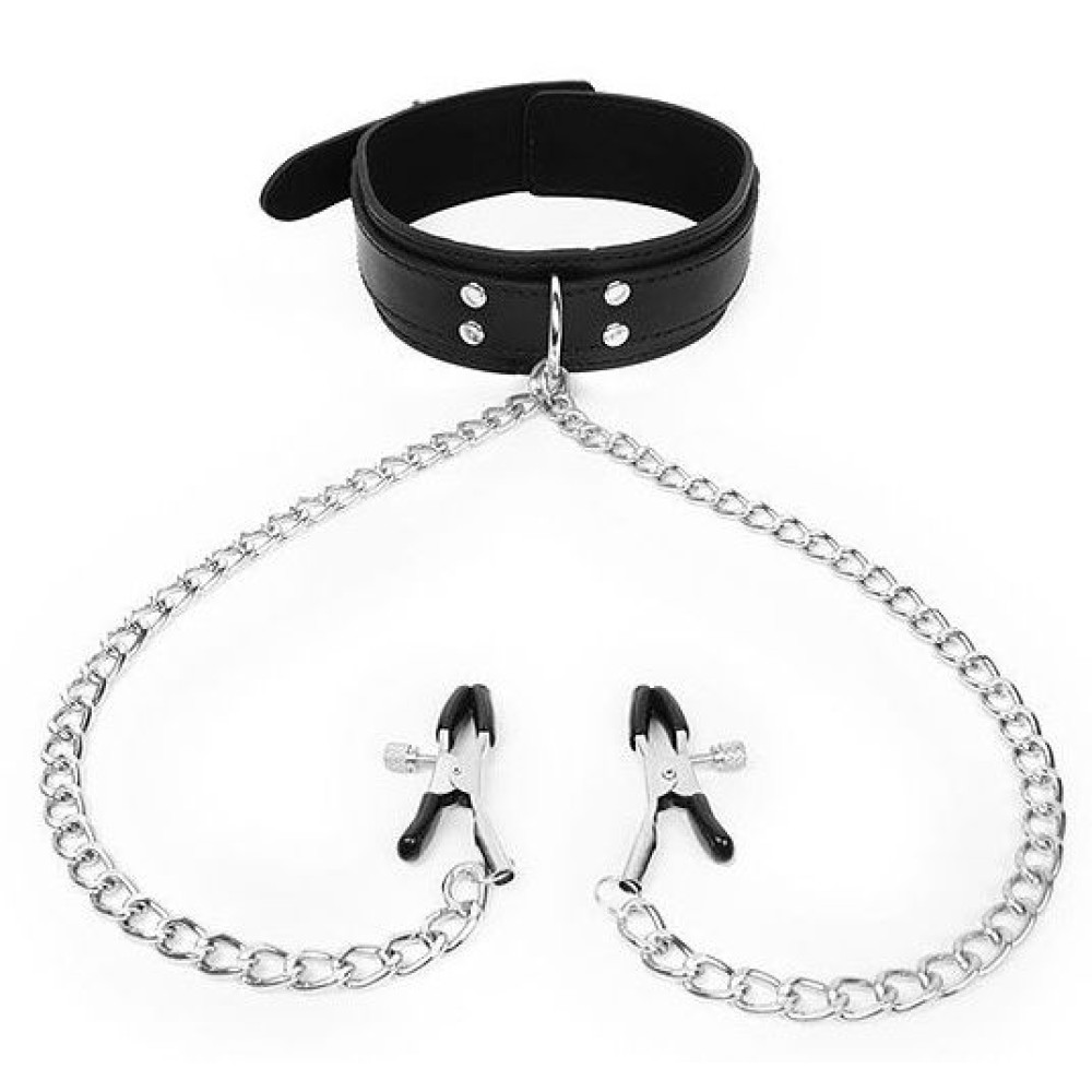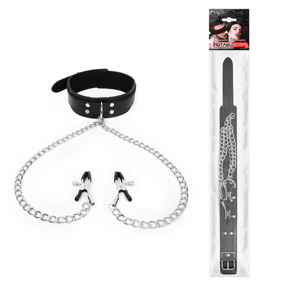 Черный ошейник с зажимами на соски на цепочке