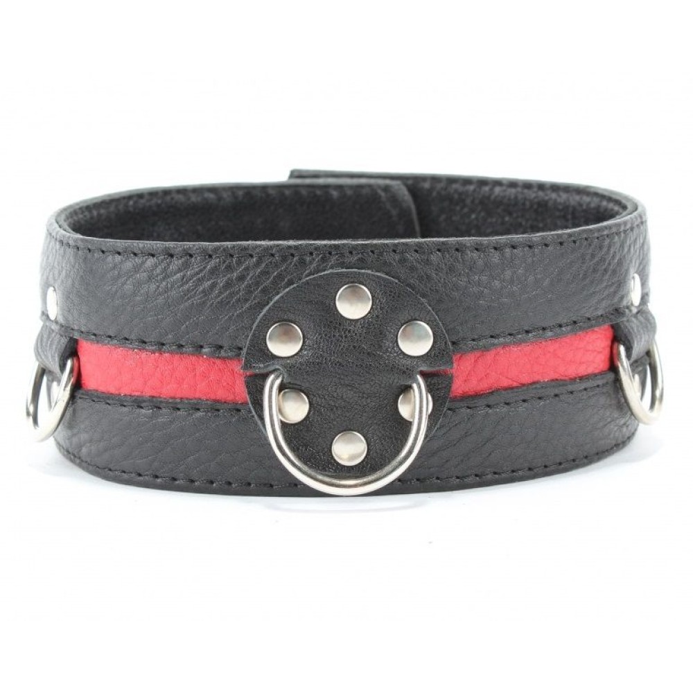 Чёрный кожаный ошейник с красной полосой и кольцами