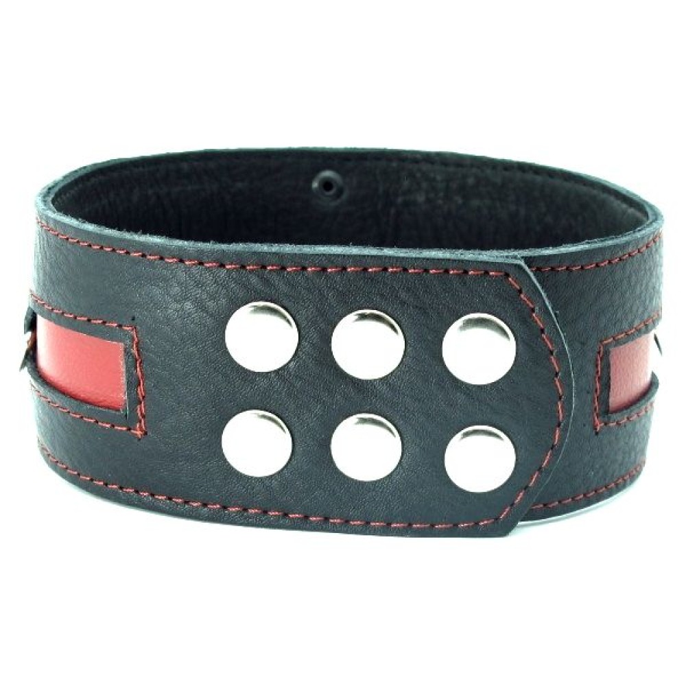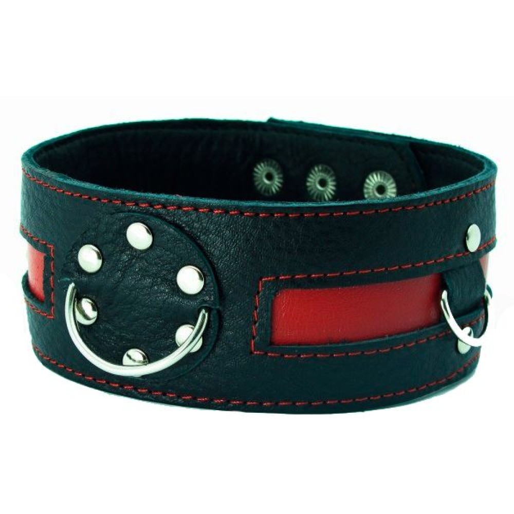Чёрный кожаный ошейник с красной полосой и кольцами — стильный аксессуар для БДСМ-практик. Изготовлен из натуральной кожи, подходит для обоих партнёров. Функциональные кольца позволяют использовать его с другими элементами экипировки. Бренд и производство — Россия. Товар поставляется без упаковки. Идеален для ролевых игр и расширения интимных границ.