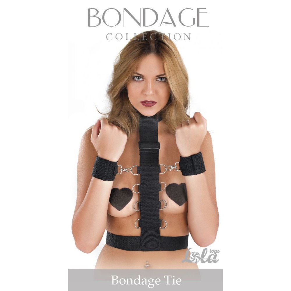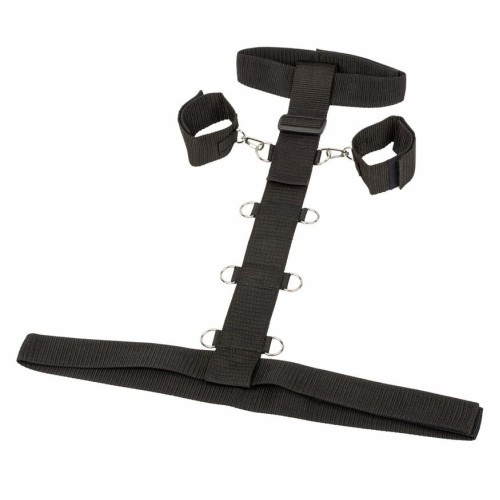 Чёрный набор для полной фиксации верхней части тела партнёра, создаёт несколько вариантов ограничения свободы. Застёгивается на груди и на спине. Несколько колец позволяют фиксировать руки на разных расстояниях. Фиксатор на талии и ошейник подходит на разные размеры. В набор входит: наручники, ошейник с лентой и шестью кольцами, к которым крепятся наручники. Длина фиксатора на талии - 96 см., ширина - 4 см.