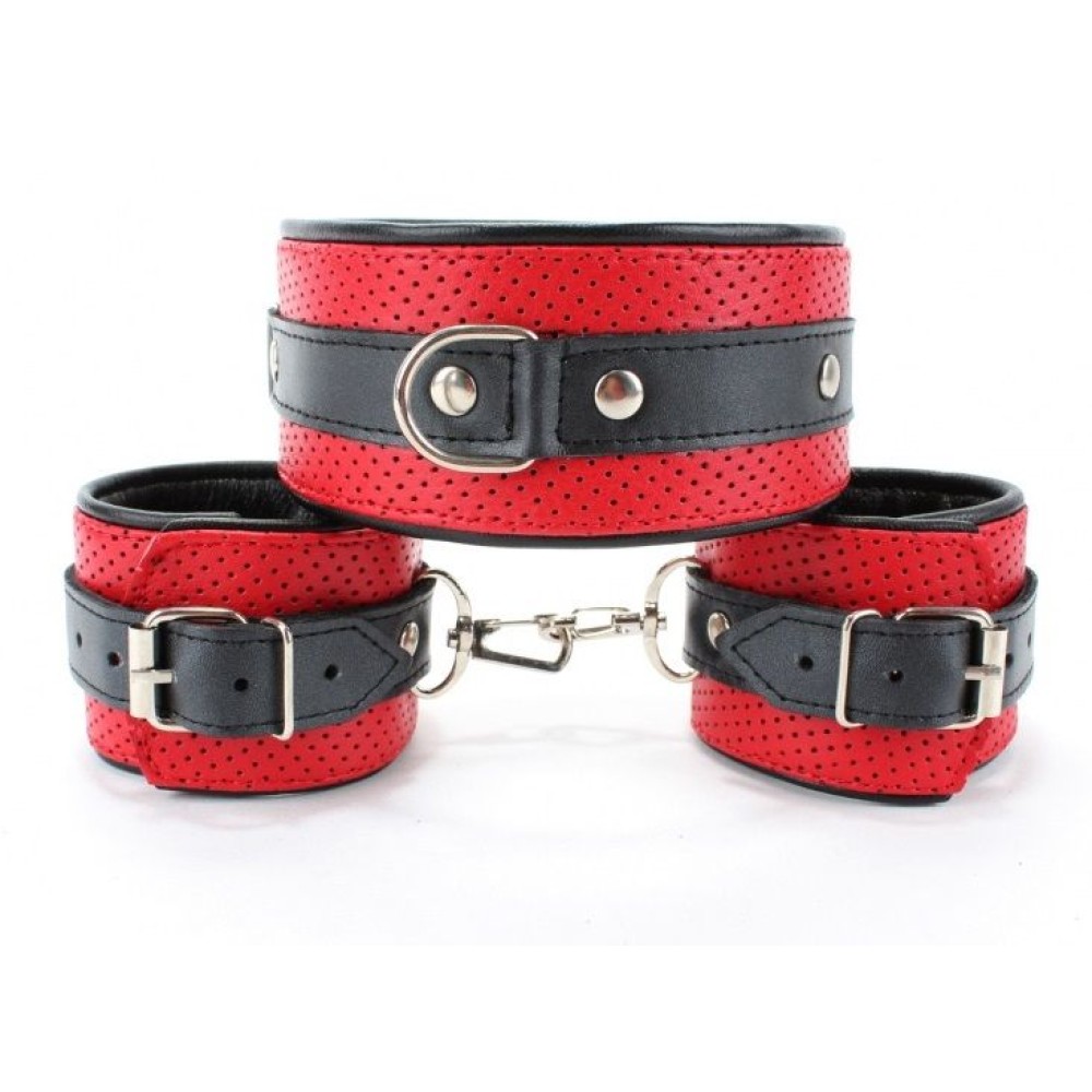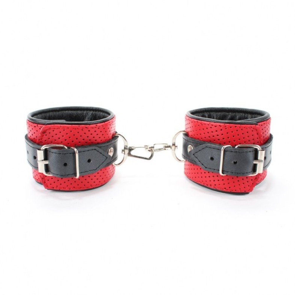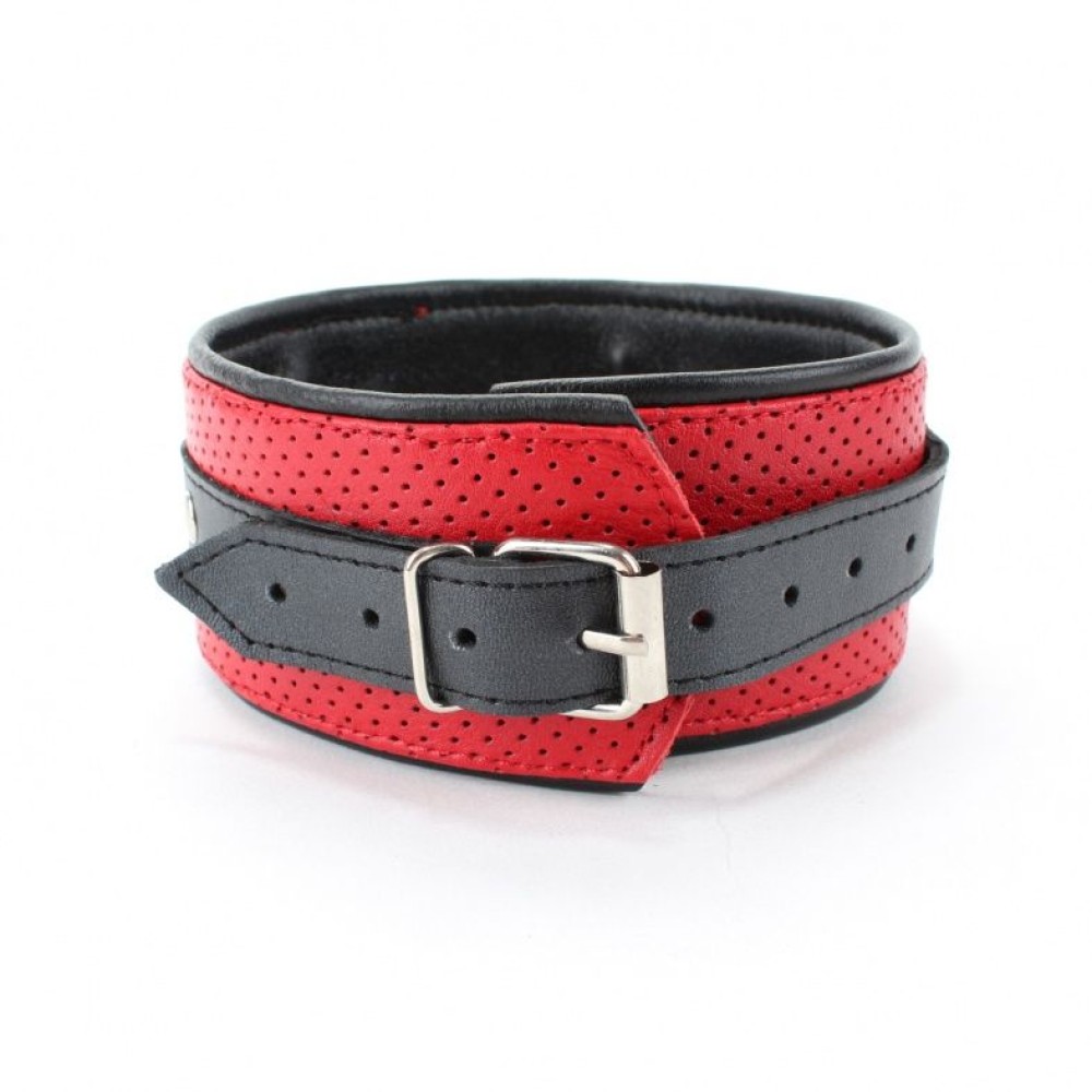 Красно-черная фиксация из перфорированной кожи для БДСМ-практик. Изготовлена из натуральной кожи российского производства. Диаметр 6 см подходит для различных частей тела. Универсальная модель для обоих партнеров. Перфорация обеспечивает комфортную фиксацию во время ролевых игр. Поставляется без упаковки. Идеально для расширения границ интимных экспериментов.