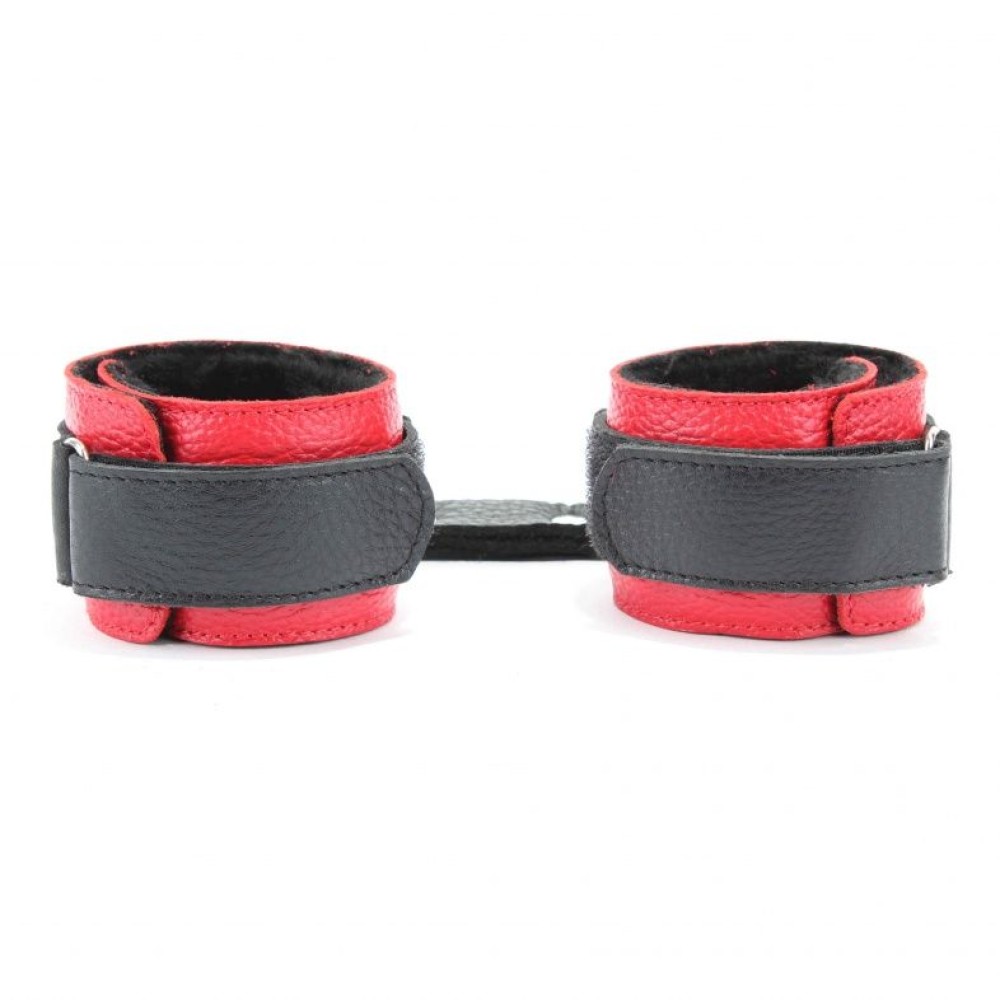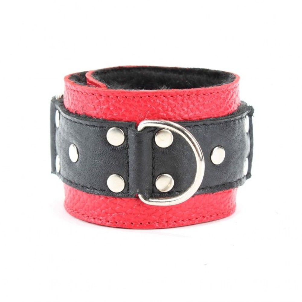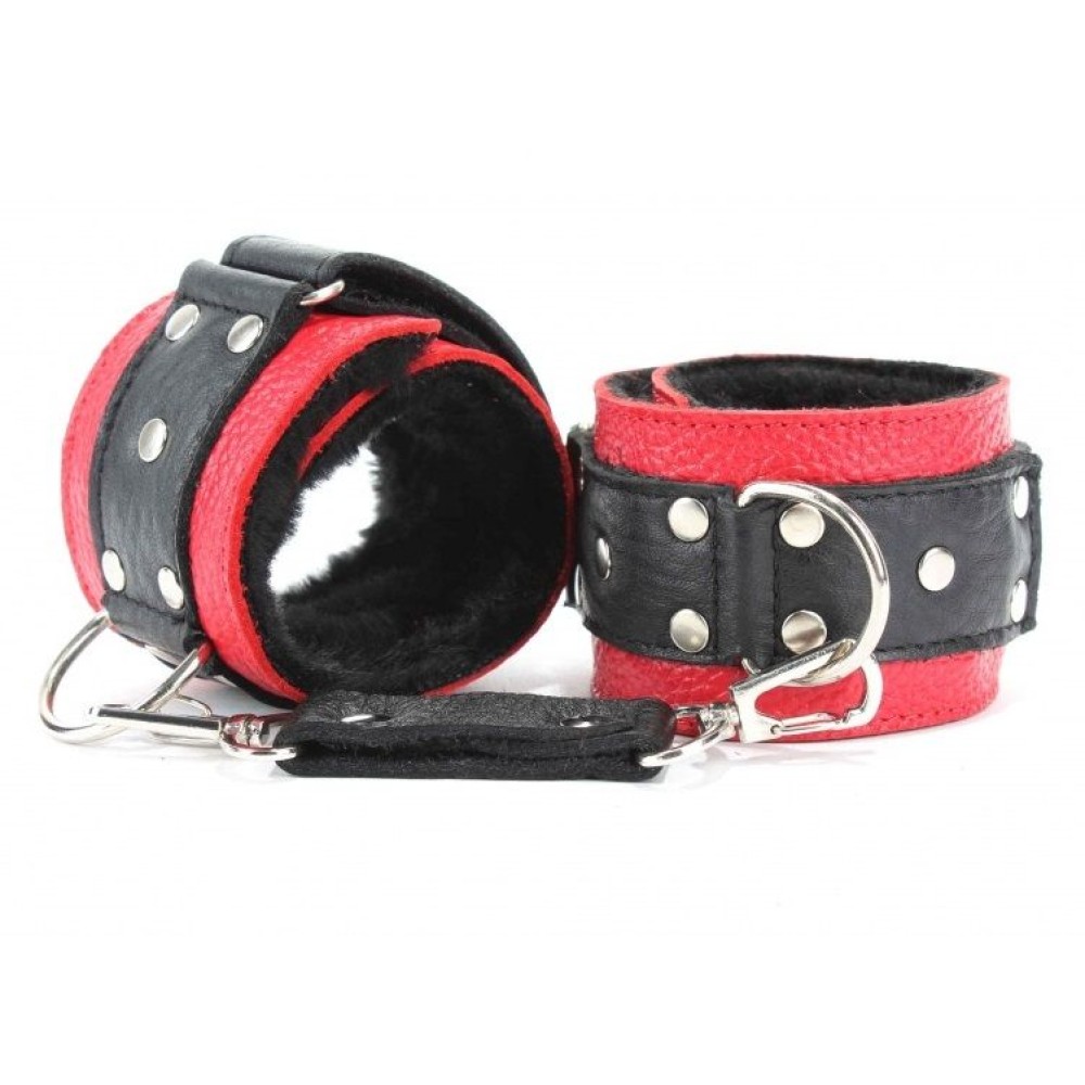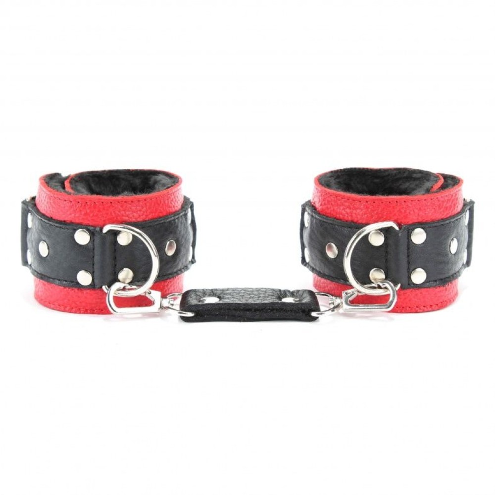 Красно-чёрные кожаные наручники с меховым подкладом для эротических игр. Российское производство из натуральной кожи. Универсальный дизайн для обоих партнёров. Мягкий меховой вкладыш для комфортного использования. Идеально для БДСМ-практик и ролевых игр. Поставляется без упаковки.