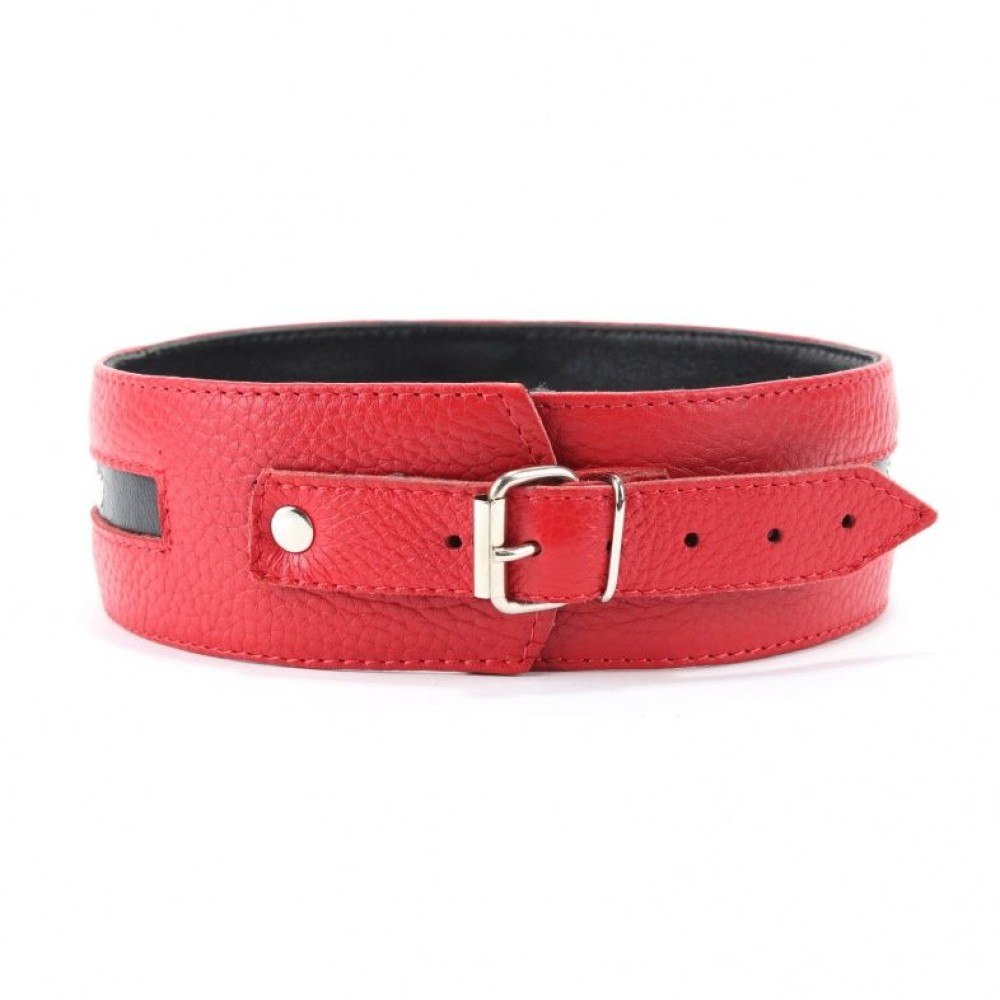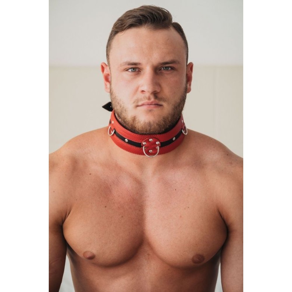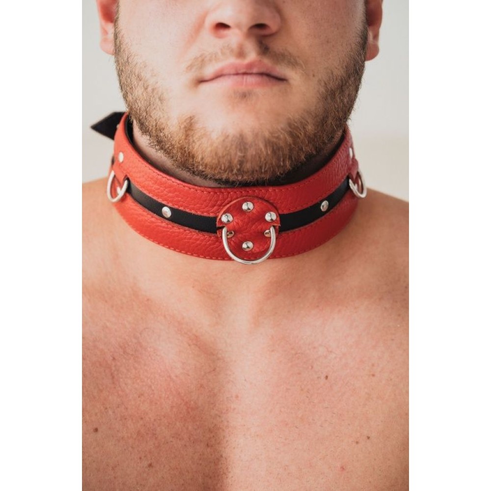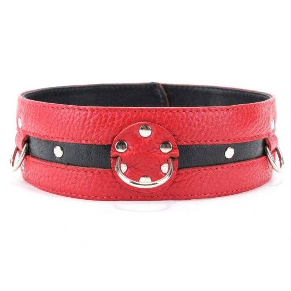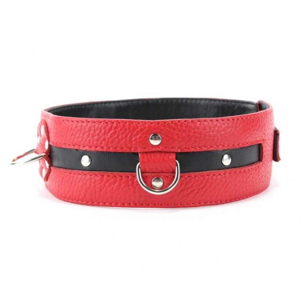 Красно-чёрный кожаный ошейник увеличенного размера для BDSM-практик. Изготовлен из натуральной кожи российского производства. Универсальная модель подходит для обоих партнеров. Идеален для ролевых игр и доминантно-субмиссивных отношений. Поставляется без упаковки. Материал обеспечивает комфорт при длительном ношении, а увеличенный размер подойдет для разных анатомических особенностей. Сочетание красного и черного цветов создает эстетически привлекательный аксессуар для интимных экспериментов.