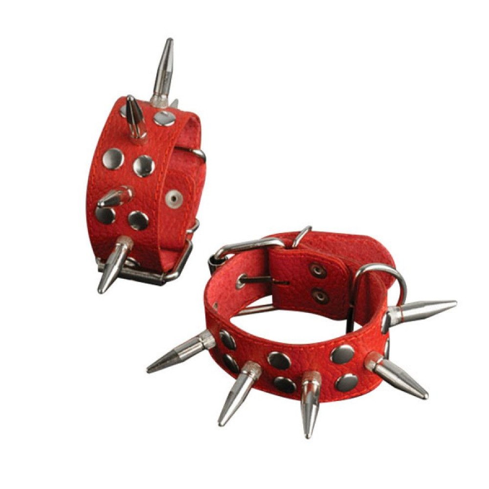 Эффектные наручники для БДСМ-практик, выполненные из натуральной кожи насыщенного красного цвета. Модель дополнена декоративными металлическими заклепками и стильными шипами, создающими дерзкий эстетический образ. Идеальный аксессуар для эротических игр и садомазохистских сценариев.