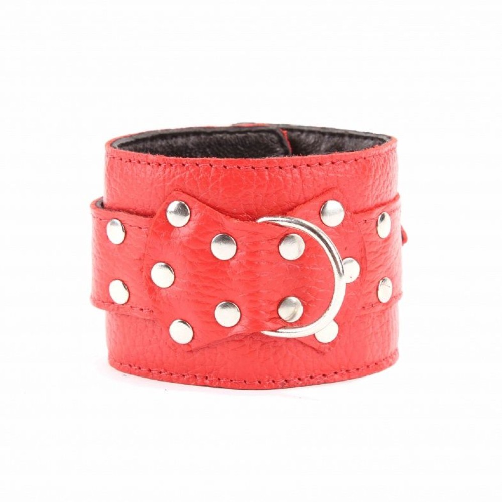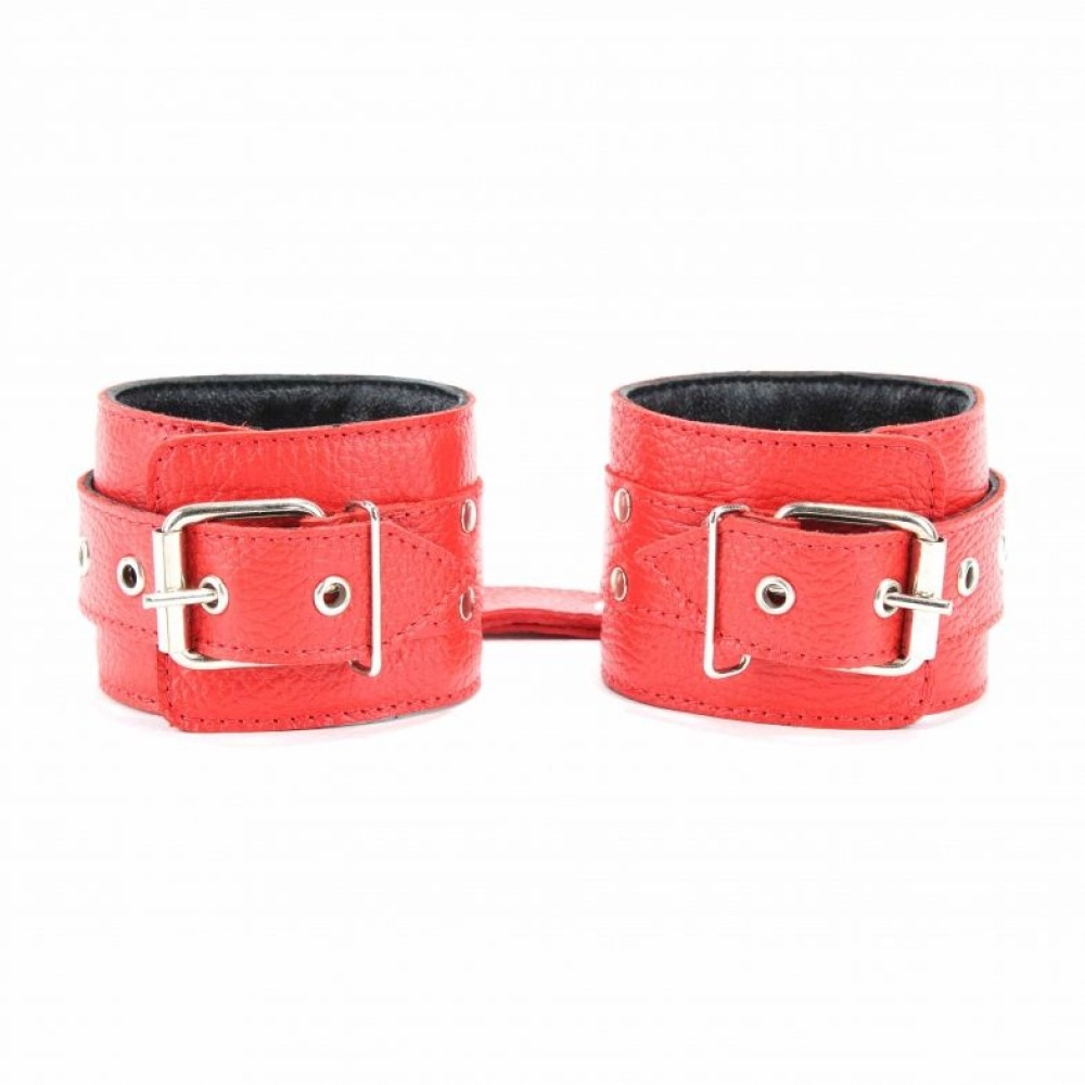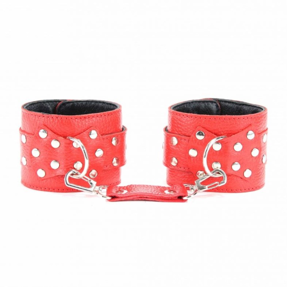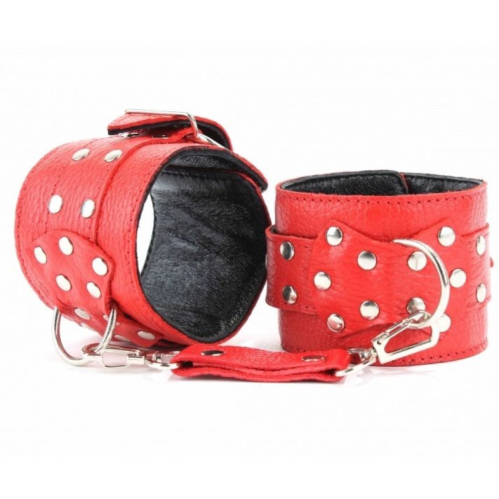 Красные кожаные наручники для ролевых игр и БДСМ-практик. Универсальный размер подходит для мужчин и женщин. Натуральная кожа обеспечивает комфорт и долговечность использования. Фурнитура из прочного металла гарантирует надежную фиксацию. Российское производство гарантирует контроль качества. Поставляются без упаковки для дискретной доставки. Идеальны для экспериментов с доминированием и подчинением в интимных отношениях.