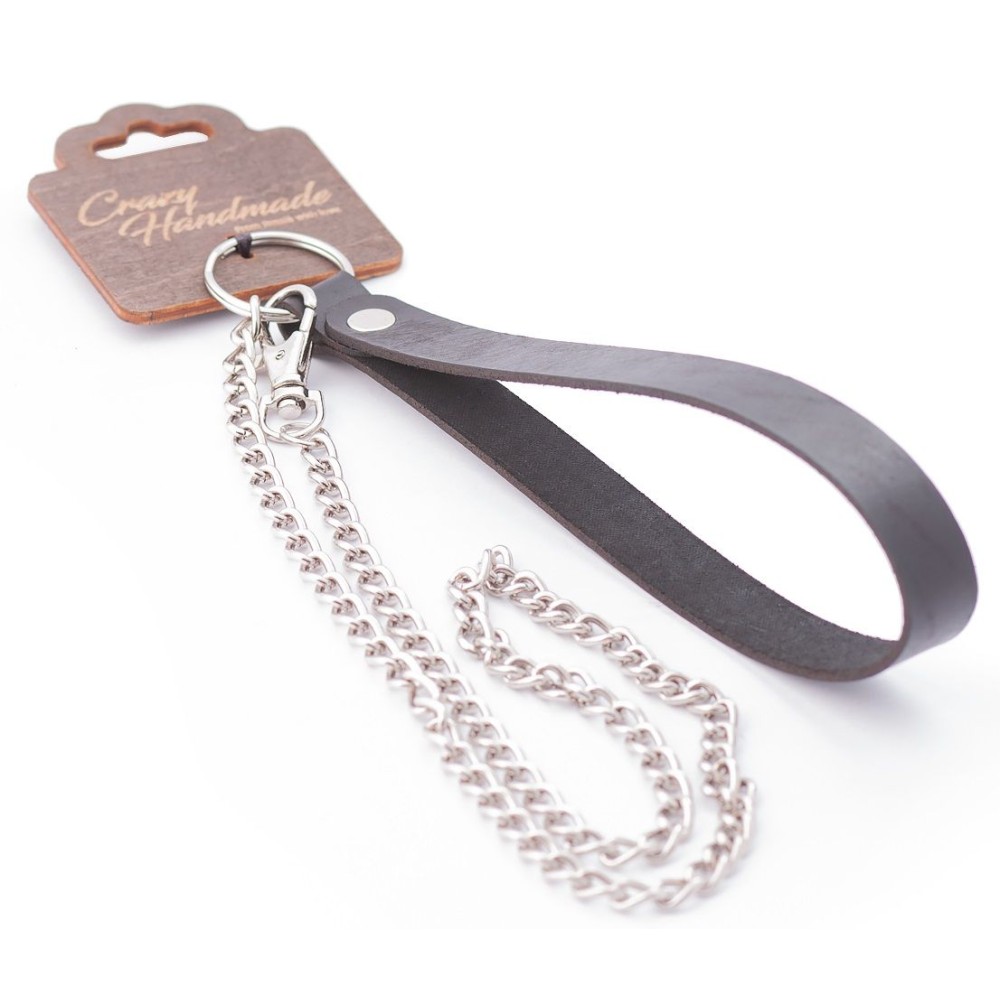 Серебристый металлический поводок с кожаной черной ручкой - 80 см.