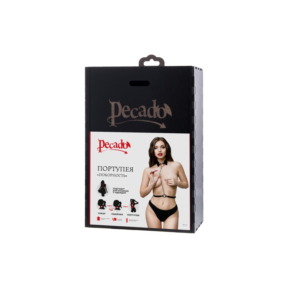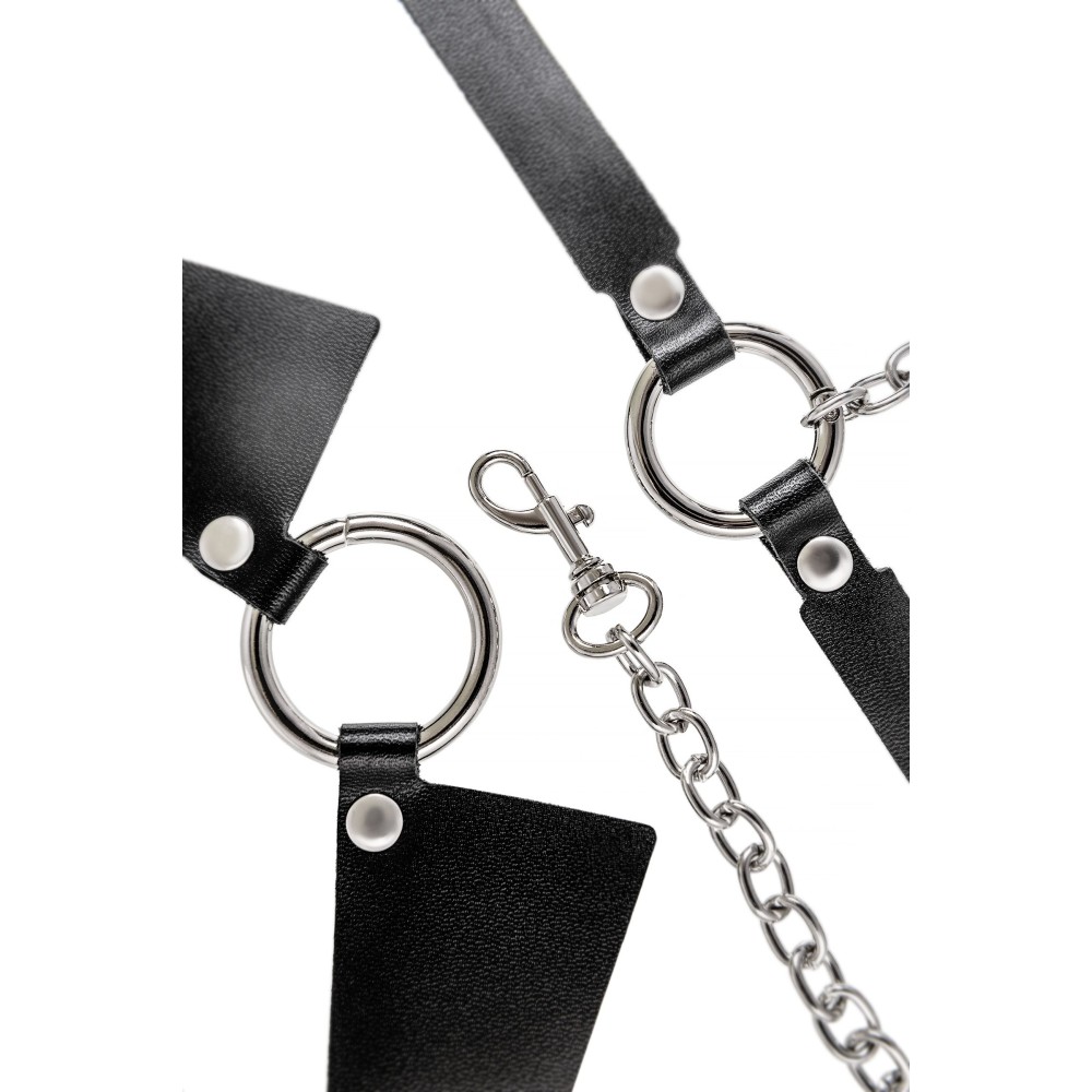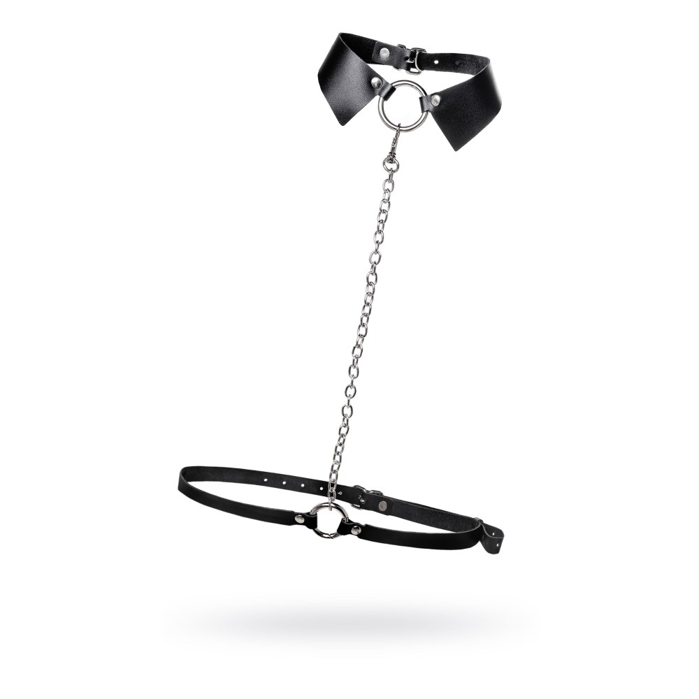 Портупея предназначена на зону шеи и живота. Аксессуар состоит из кожаного воротничка, ремней и металлической цепочки. Преимущество данной портупеи в том, что она легко превращается в ошейник с поводком или без. Натуральная кожа в меру мягкая, не тянется. Материал не вызывает раздражения и приятен на ощупь. Имеет универсальный размер и хорошо садится на девушках с любым телосложением. Регулируется по ширине с помощью стальной застежки. Чокер декорирован металлическим кольцом. К нему крепится небольшой, съемный карабин, который соединяет воротник-ошейник с поясом. Хотите подразнить партнера? В любой момент ремни на талии можно легко и быстро снять, с помощью удобного кольца-карабина. Достаточно только нажать на него и благодаря паре движений превратить пояс в ручку от поводка. Атрибут подчеркивает талию и создаёт акцент на груди. Используйте портупею как яркий аксессуар в гардеробе: сочетайте с рубашкой, водолазкой, платьем, нижним бельем.