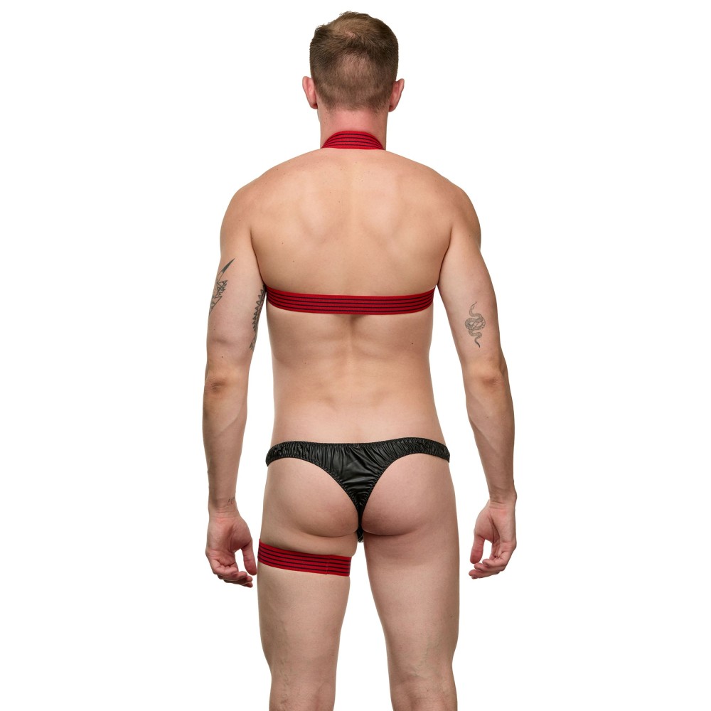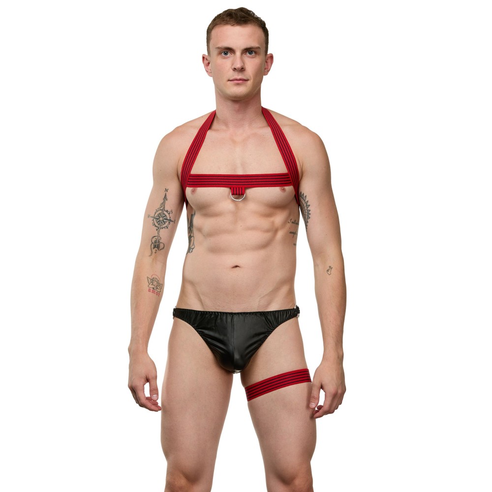 Костюм изготовлен из качественного материала: 60% полиамид, 40% полиуретан, что обеспечивает комфорт при ношении и идеально подчеркивает мужскую фигуру. Сочетание насыщенного черного и страстного красного создает неповторимый визуальный эффект.