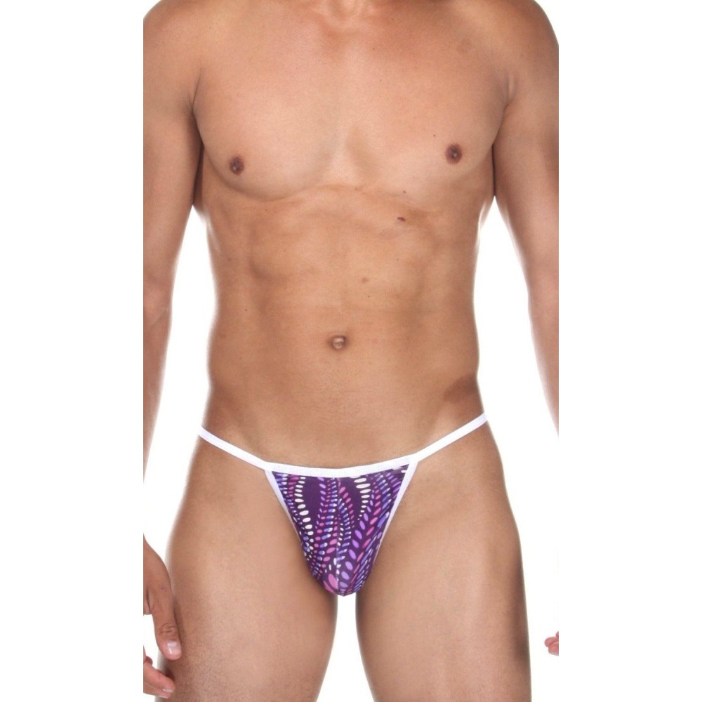 Фиолетовые трусы-стринги с принтом и контрастной отделкой.