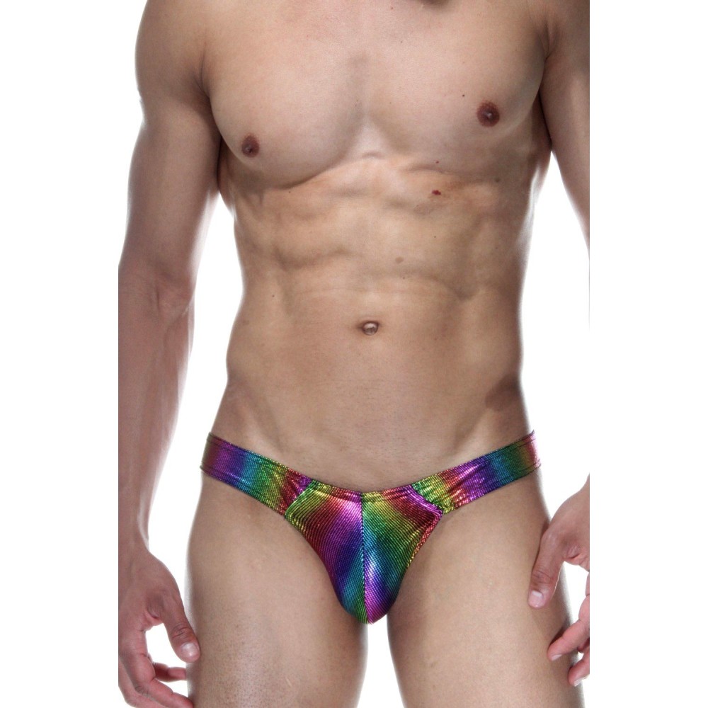 Эти стильные мужские трусы-бразилиана станут ярким акцентом в вашей интимной жизни! Радужная расцветка в сочетании с блестящей тканью создает неповторимый эротический образ.