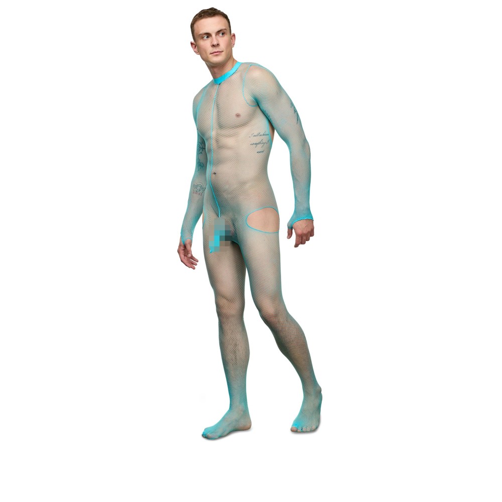 Мужской бирюзовый сетчатый кэтсьюит с интимным доступом