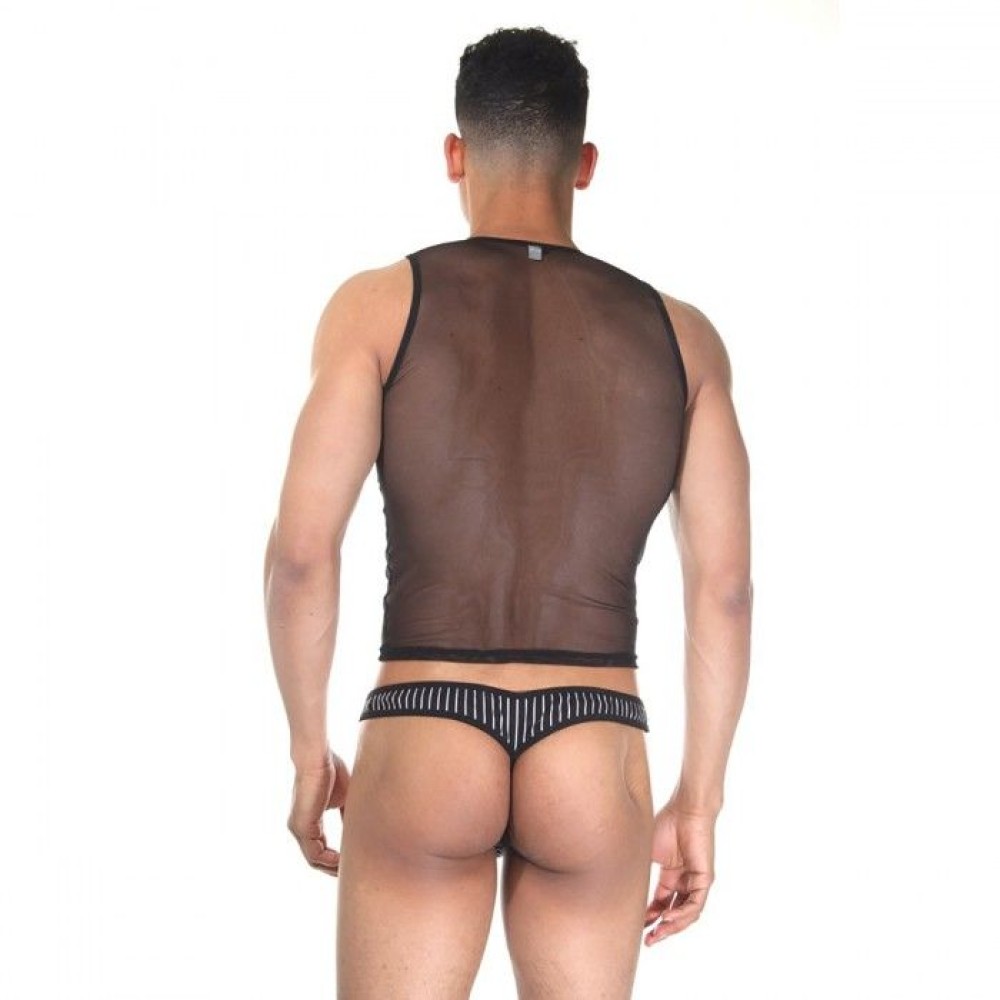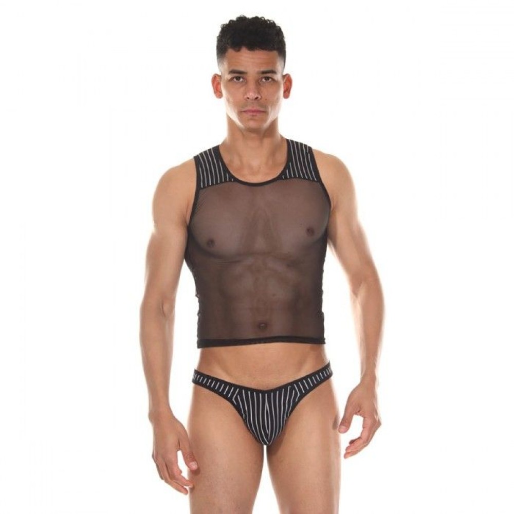 Мужской комплект: короткая майка и трусы-тонги в полоску. Стильный эротический набор для смелых мужчин, который подчеркнет вашу мужественность и сексуальность. Облегающая майка и соблазнительные танга созданы из качественного материала 85% полиэстер, 15% эластан - обеспечивают идеальное прилегание, комфорт и свободу движений. Турецкое качество гарантирует долговечность и сохранение формы после многократных стирок. Эротичная одежда упакована в прозрачный пакет - готовый вариант для подарка или романтического вечера. Подчеркните свою индивидуальность и привлекательность с этим стильным комплектом!