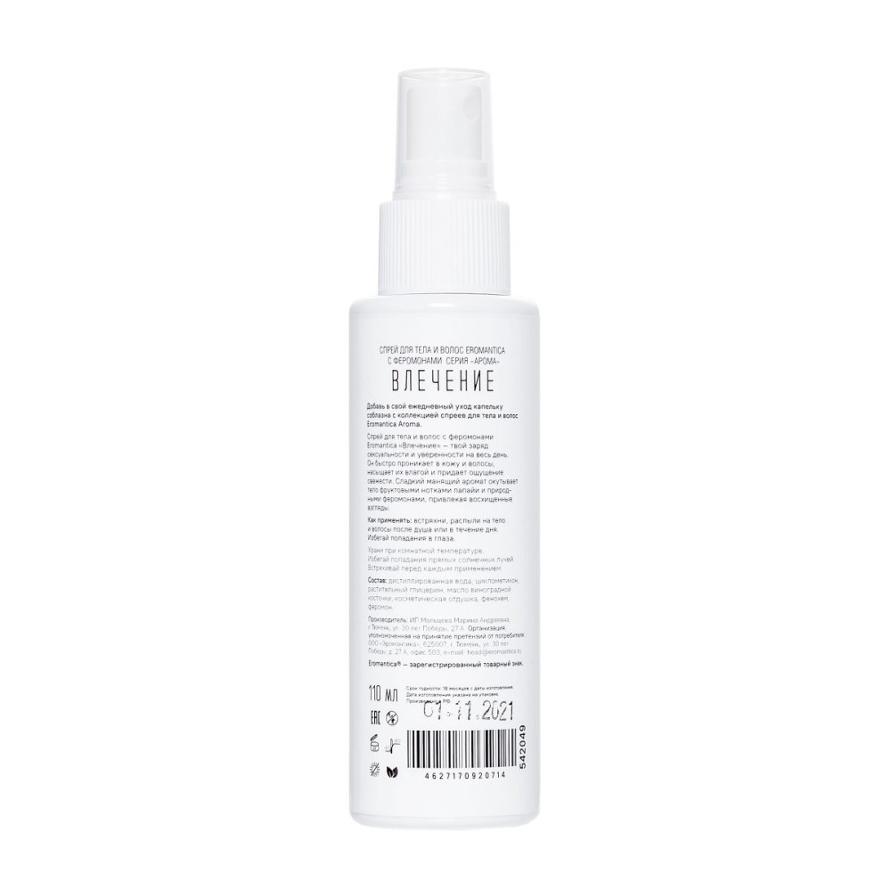 Состав спрея включает дистиллированную воду, циклометикон, оливковое масло, глицерин, косметическую отдушку, фиксатор аромата, шаромикс, полисорбат, феромоны и ТВИН-80. Эти компоненты обеспечивают нежное нанесение, стойкий аромат и возбуждающий эффект, усиливающий влечение.