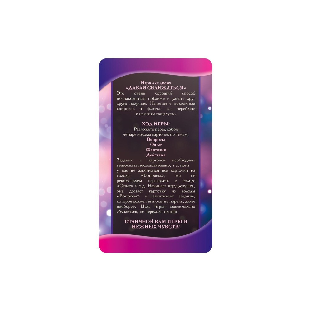 Продукт произведен в России под контролем бренда из Китая, что гарантирует качество и доступность. Упакован в прочную картонную коробку, обеспечивающую сохранность и эстетичный вид. Функция эротических игр делает фанты универсальным выбором для романтических вечеров, свиданий или спонтанных моментов страсти. Погрузитесь в мир фантазий и откройте новые способы сближения с этим интригующим набором!