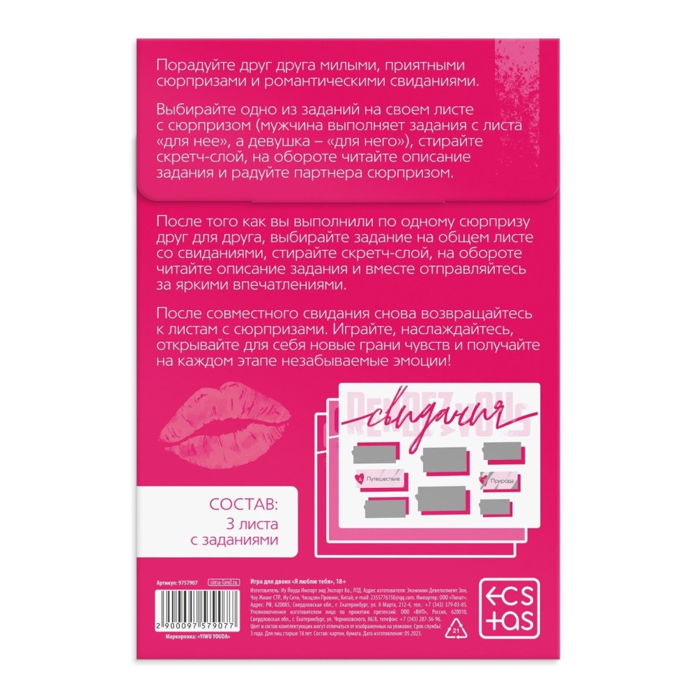 Продукт производится в России под контролем бренда из Китая, что гарантирует доступность и соответствие стандартам. Упакован в надежную полиэтиленовую пленку для сохранности при транспортировке. Идеально подходит для пар, которые хотят добавить элемент неожиданности и страсти в свои отношения. Используйте игру, чтобы усилить эмоциональную связь и сделать каждый вечер незабываемым.