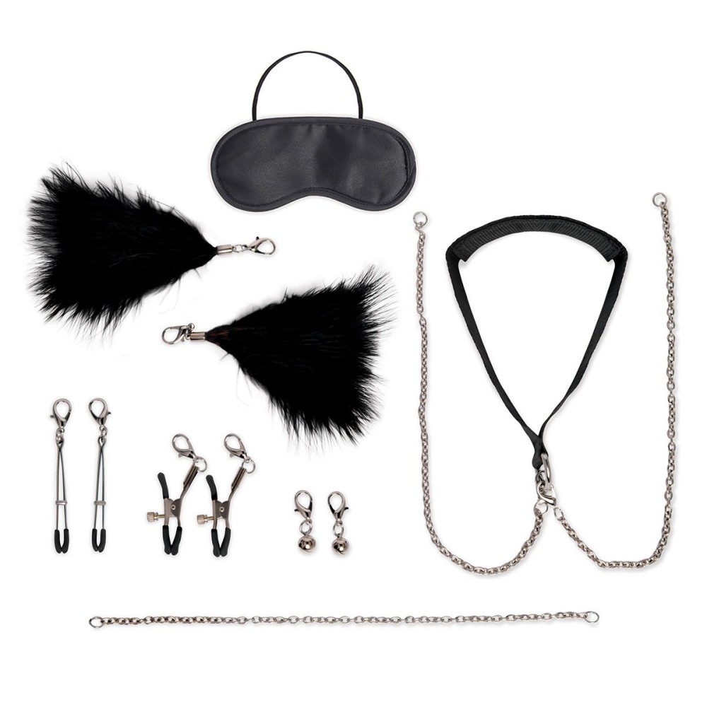 Набор включает сменный ошейник и зажимы для сосков, выполненные из качественного металла, что обеспечивает долговечность и приятные тактильные ощущения. Каждый предмет легко комбинируется, позволяя создавать уникальные эротические сценарии.