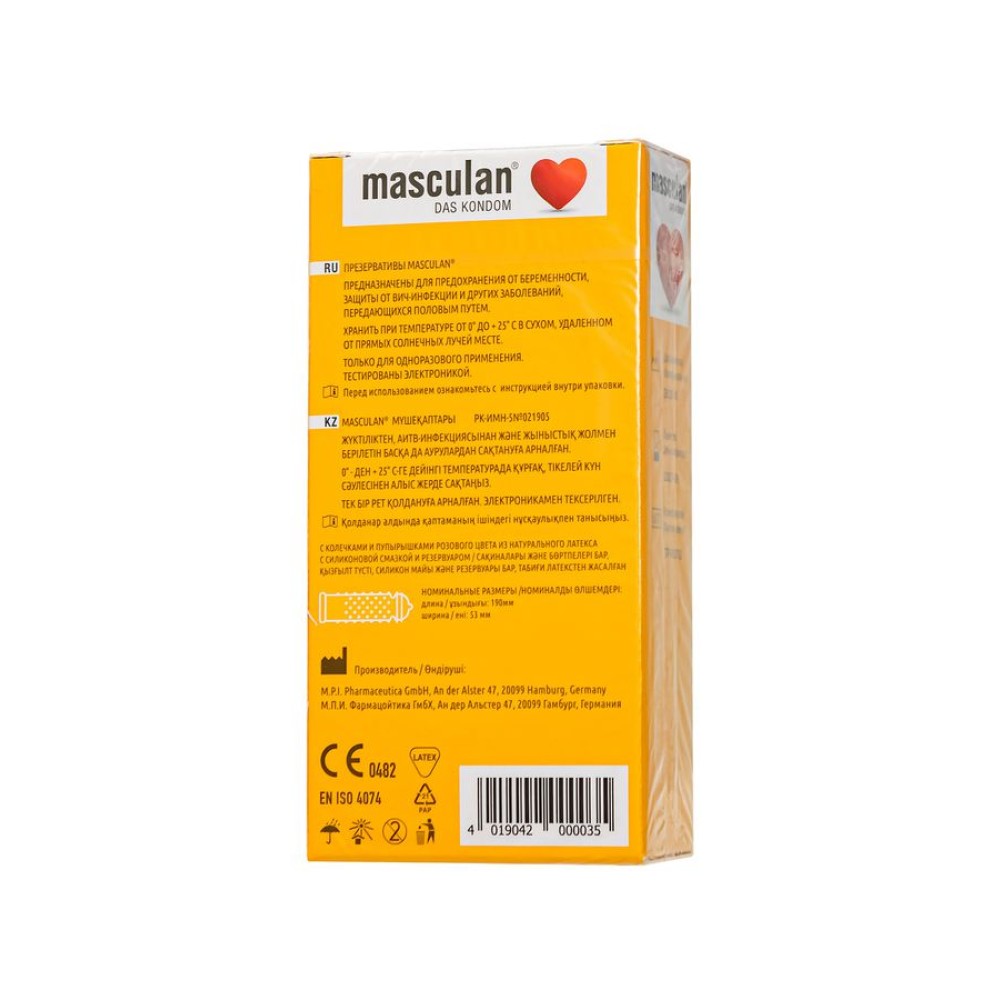Изготовлены из высококачественного латекса длиной 19 см, что гарантирует комфортную посадку. В упаковке 10 презервативов в стильной картонной коробке. Немецкое качество бренда Masculan обеспечивает надежность и безопасность. Идеальны как дополнительный аксессуар для разнообразия интимной жизни.