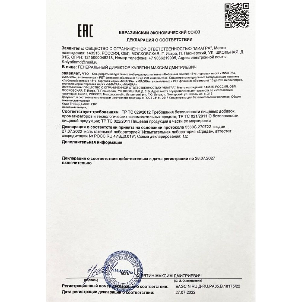 | Инструкция по применению | 5-10 капель растворить в жидкости за 10-20 минут до секса. |