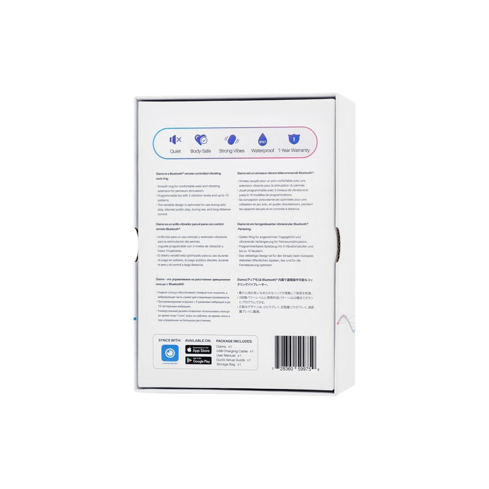 Diamo - это вибрирующее кольцо с дистанционным управлением по Bluetooth для комфортного ношения, которое обеспечивает более жесткую и продолжительную эрекцию и увеличивает сексуальную выносливость, идеально подходит для использования во время одиночной игры, скрытой публичной игры, во время секса и управления на большом расстоянии. Внутренний диаметр - 4,5 см.