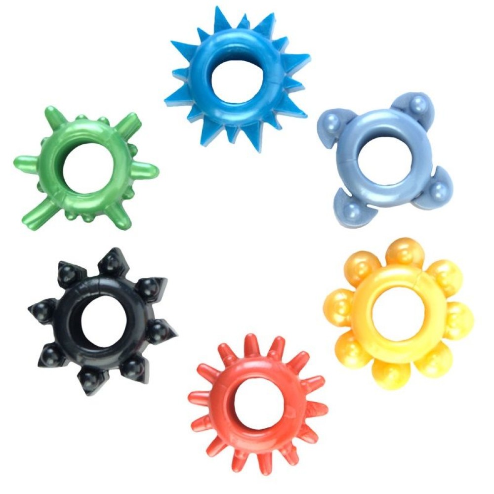 Набор из 6 разноцветных эрекционных колец для мужчин. Диаметр каждого кольца 2 см. Изготовлены из качественного поливинилхлорида (ПВХ). Функция - усиление и продление эрекции. В наборе 6 разноцветных колец. Упаковка - картонная коробка. Бренд и производство - Китай.