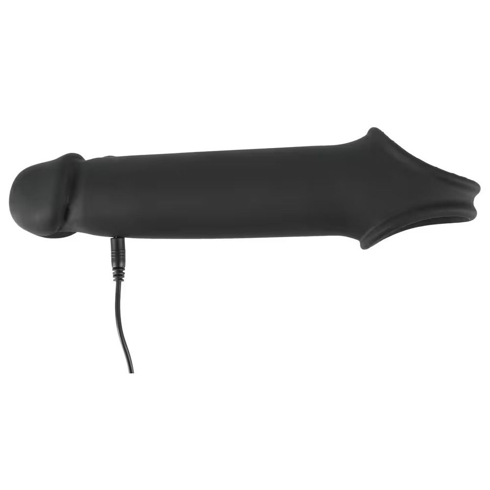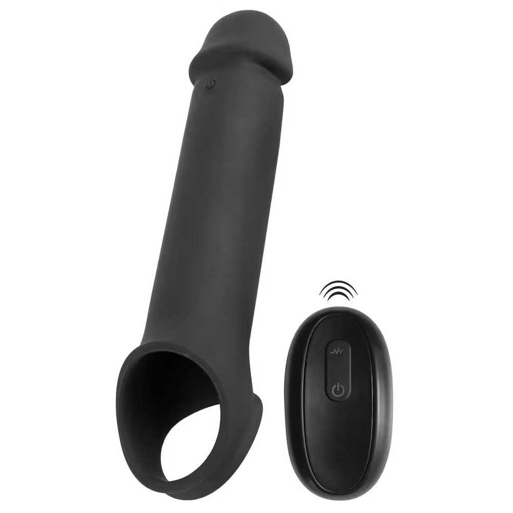 Эластичная насадка для пениса с вибрацией и хомутом для яичек, предназначенная для увеличения длины пениса и поддержки эрекции. Головная часть насадки увеличивает длину пениса до 8 см. Насадка плотно облегает пенис и легко надевается. Хомут для яичек обеспечивает надёжную фиксацию и помогает удерживать насадку на месте во время использования. Встроенный вибромотор имеет 10 режимов вибрации, управляемых с помощью беспроводного пульта (дальность до 12 метров). Рабочая длина - 19 см.