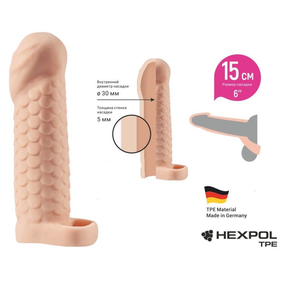 Изготовлена из высококачественного эластомера, который нежно прилегает к коже и легко очищается. Насадка увеличивает длину фаллоса на 15 см, обеспечивая уверенность и комфорт во время интимных моментов.