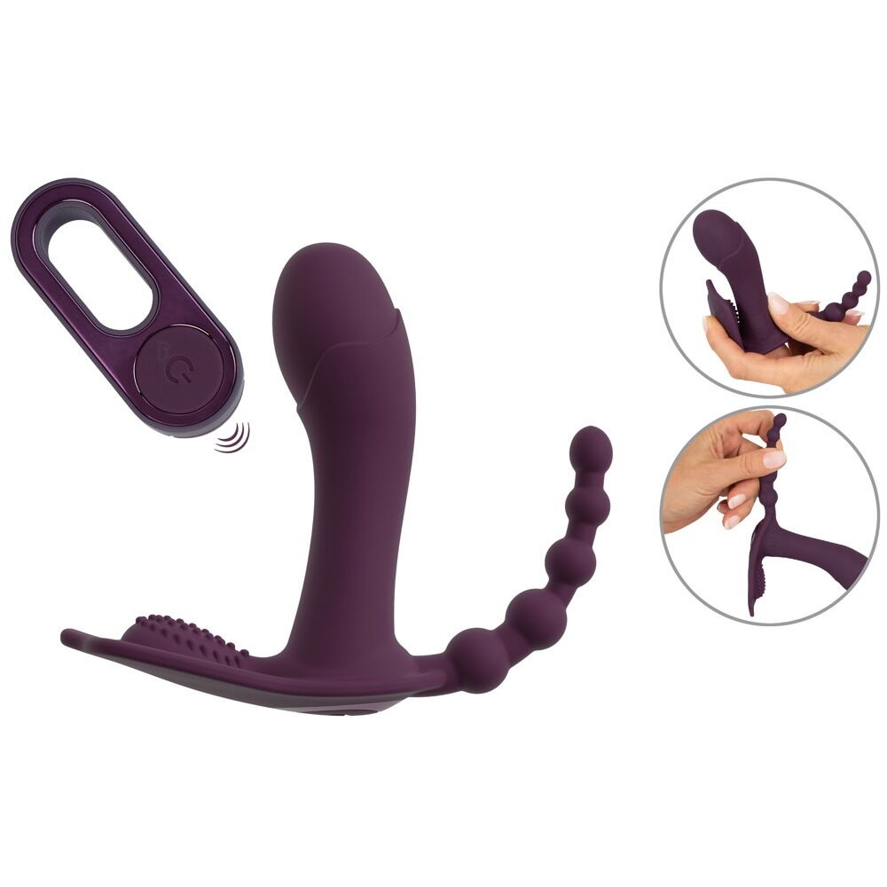 Изготовленный из тончайшего силикона шелковистый стержень с пухлой головкой легко вводится. Мягкая ворсистая подушечка ласкает клитор. Гибкий стимулятор в виде пули разного диаметра ублажает анальную зону. Вибратор в трусиках гибко подстраивается под тело и повторяет каждое движение. Это означает, что тройная вибрация всегда ощущается интенсивно - как внутри, так и снаружи. Тройное удовольствие, которое можно получить везде! Длина вагинального отростка - 10 см, диаметр - 3,2 см.